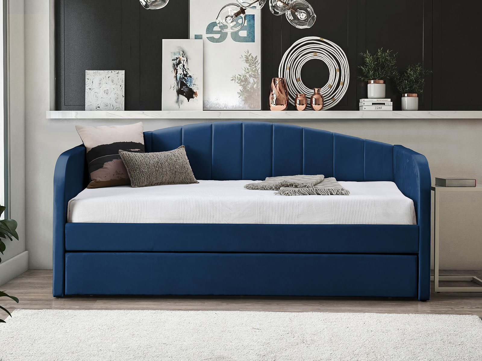 A contemporary fabric day bed in a deep blue shade, combining comfort and style. Ideal for modern interiors, it provides a versatile sleeping and seating solution.