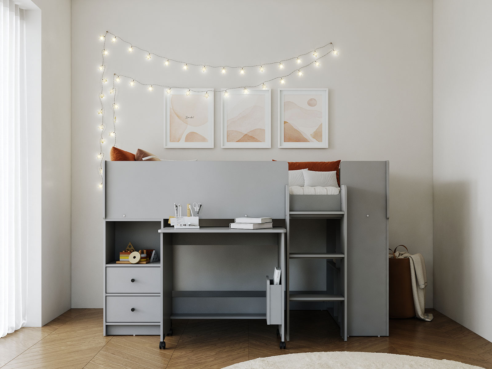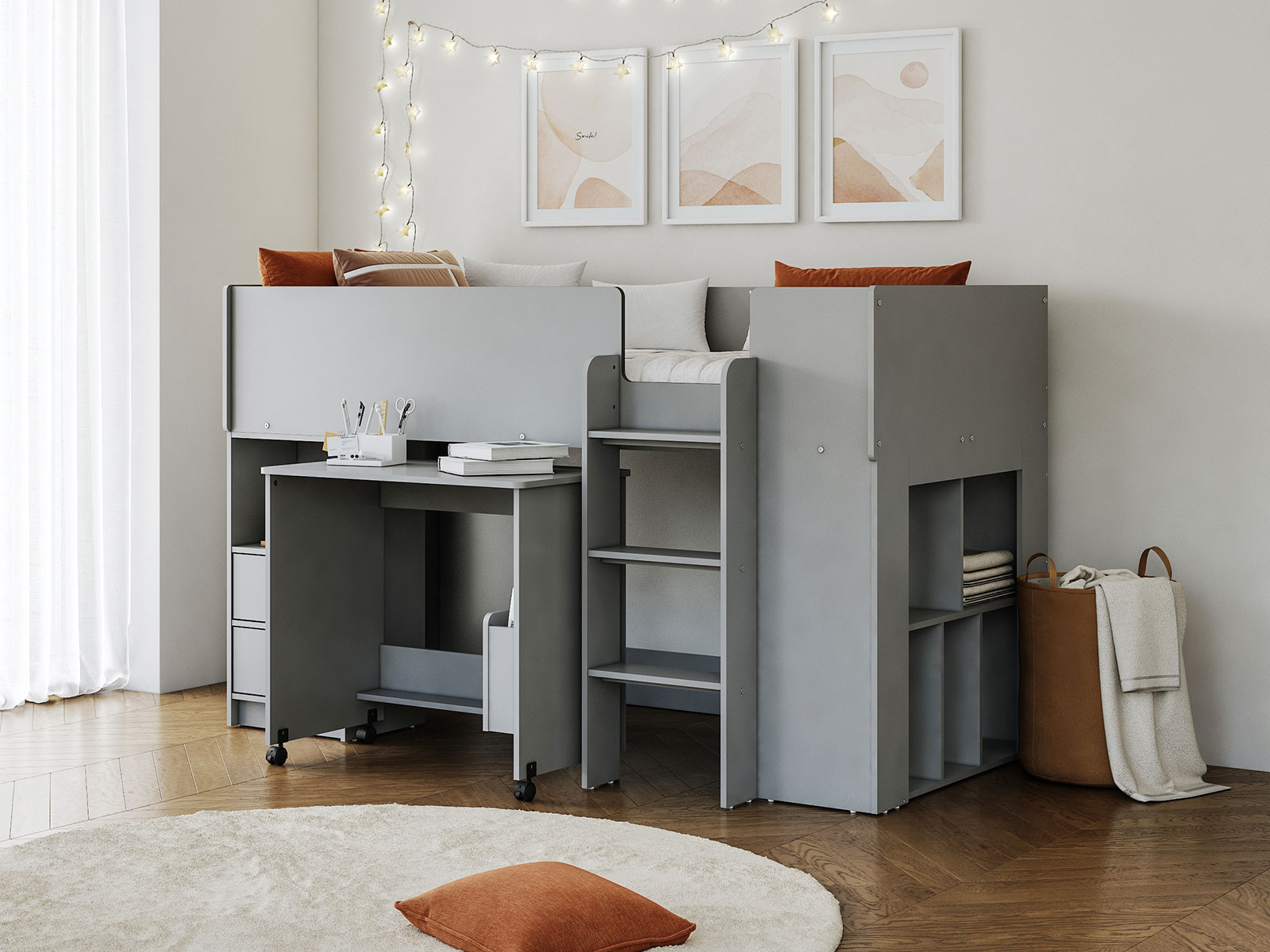 A space-efficient mid sleeper bed in a modern grey finish, complete with built-in storage and a practical design ideal for children’s bedrooms.