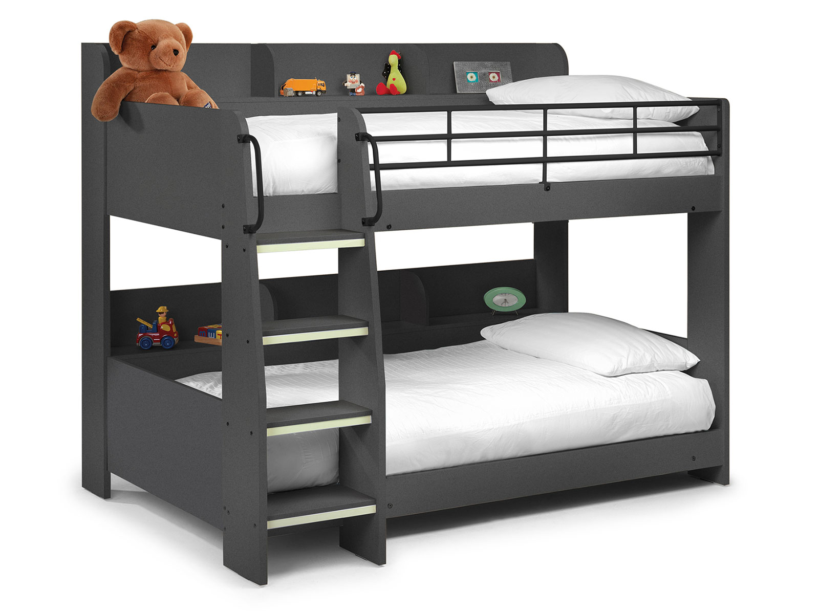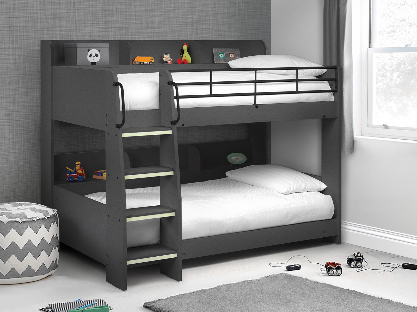 The domino bunk combines anthracite effect foil to create this stylish bunk bed. Unique to this product is the added shelving along the back of each bunk to give that much needed additional storage space. Another nice feature of the Domino is the Luminous ladder steps that glow in the dark!