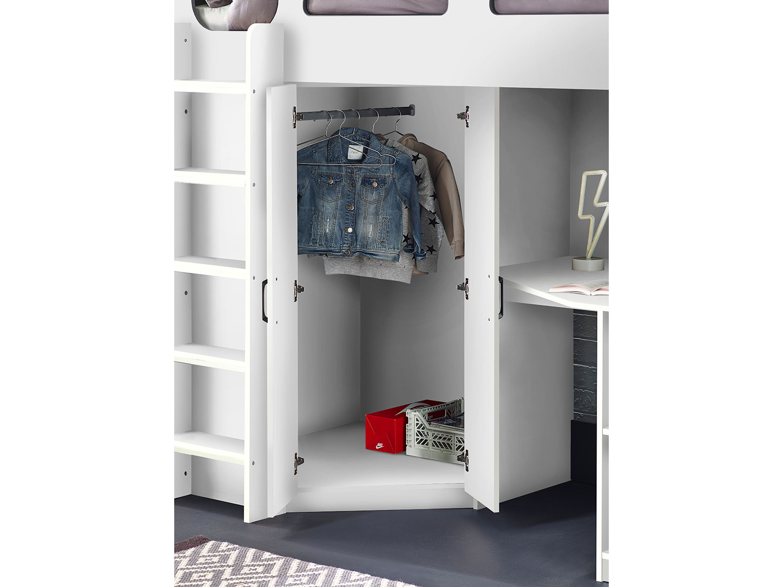Designed with perfect functionality, the Hercules Highsleeper is the ultimate bed for your child. The angled wardrobe provides ample space for clothing, whilst the built-in shelving is great for all their files, folders, trainers, or games to stay organised. With glow-in-the-dark steps, and colourways of woodgrain and anthracite, white, and anthracite, there is an option for any interior style.