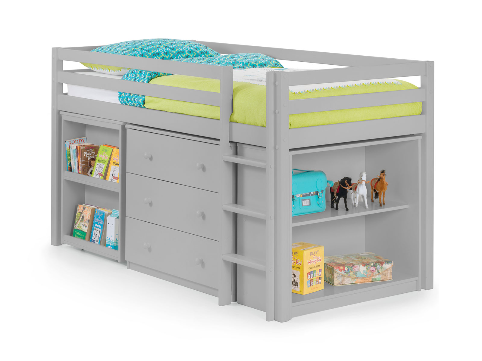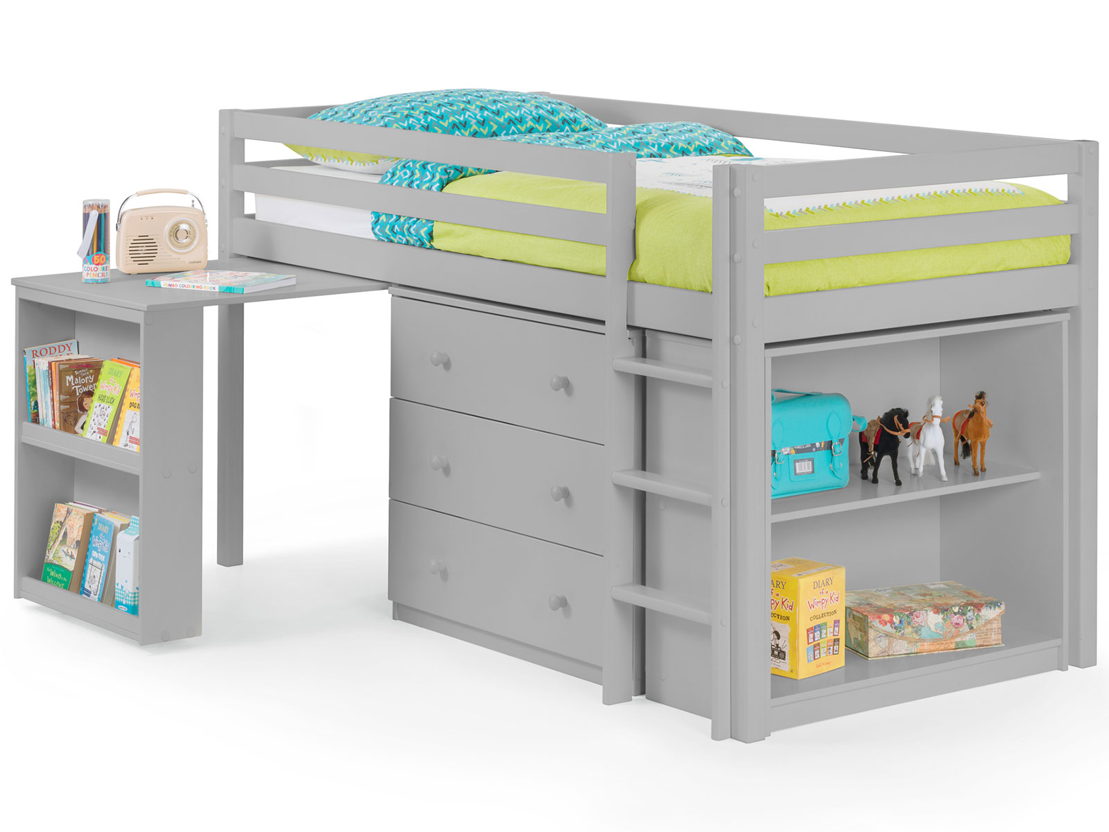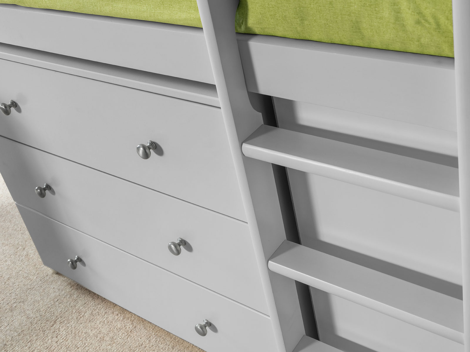 Roxy is an extremely clever and practical piece of children’s furniture that offers incredible functionality and great value for money. Roxy’s compact footprint is supported by a robust, solid pine framed construction and offers numerous useful features from a handy pull-out desk to ample shelving and cupboard space. Immaculately finished in a smooth dove grey lacquer, Roxy comes with two choices of handle in either traditional painted wood, or a contemporary brushed steel finish. Roxy is also available in Stone White