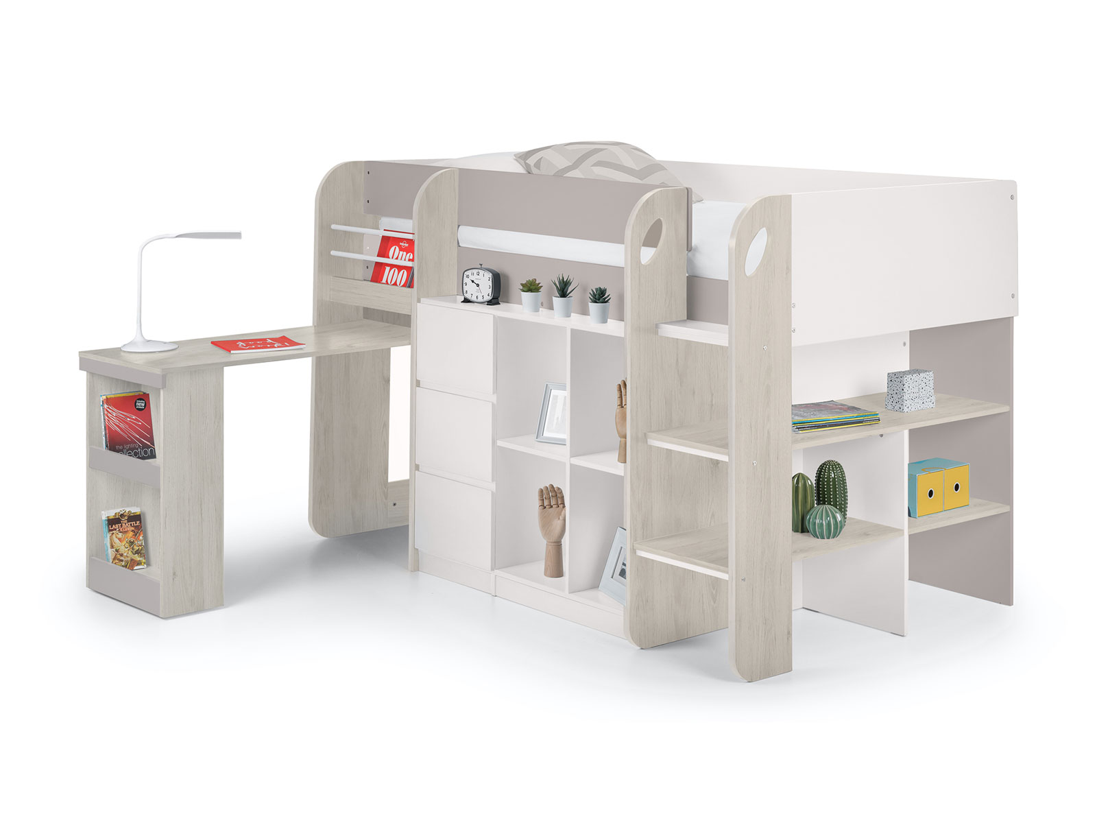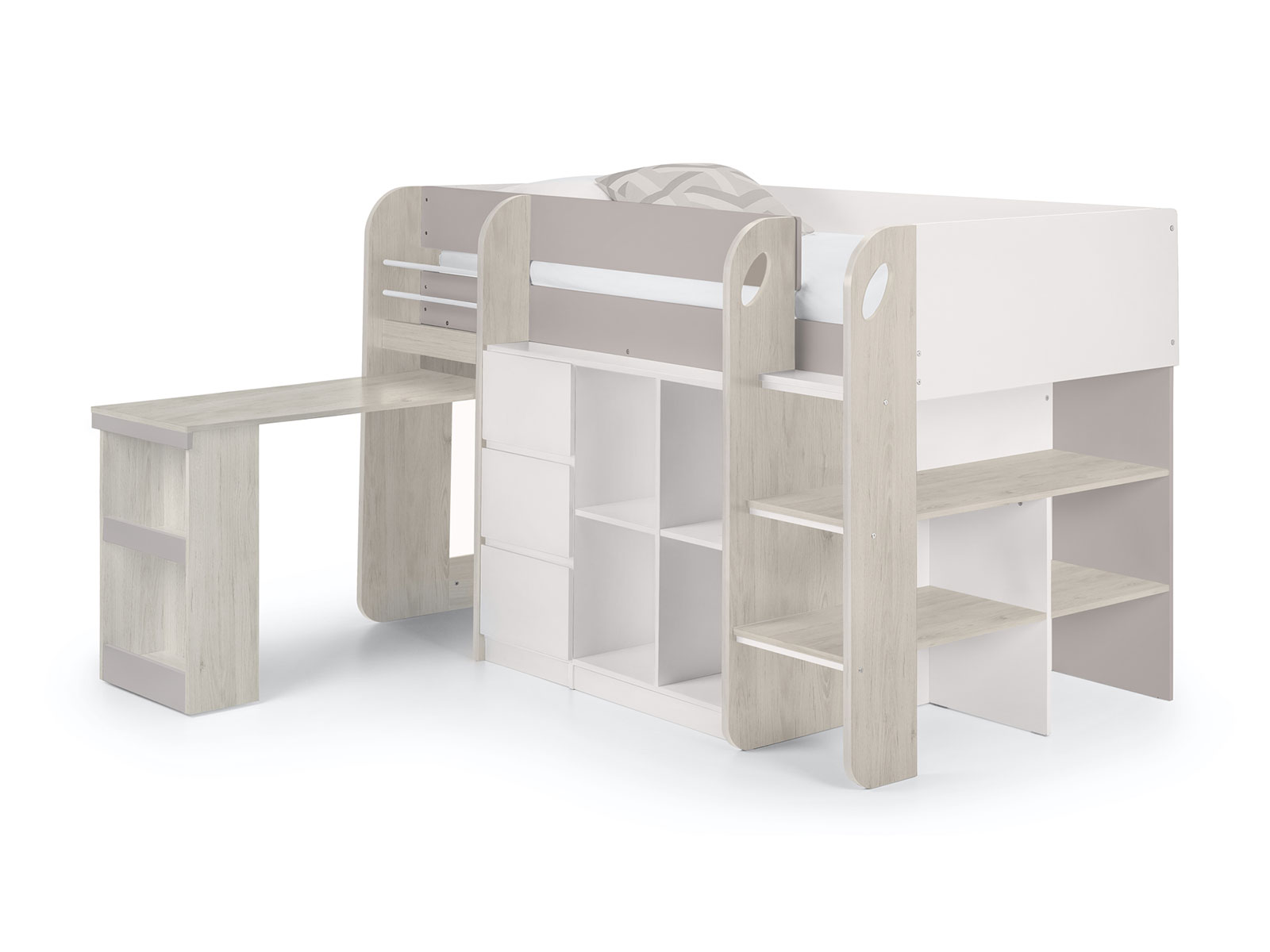 Offering a compact, space saving design, the Saturn Midsleeper features a bookcase, 3 drawer chest, and a cube bookcase saving floor space for toys and more. Finished in a modern taupe and white, this midsleeper is perfect for a wide range of childrens bedroom decor. Crafted from sturdy particleboard, this bed has a wooden slatted base and fits a UK single mattress.