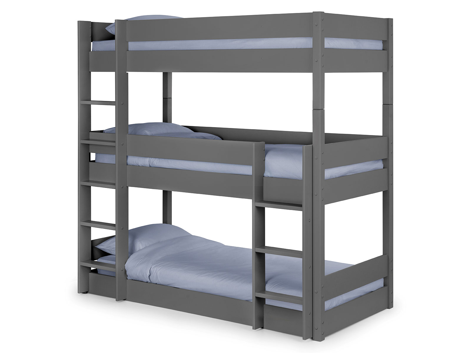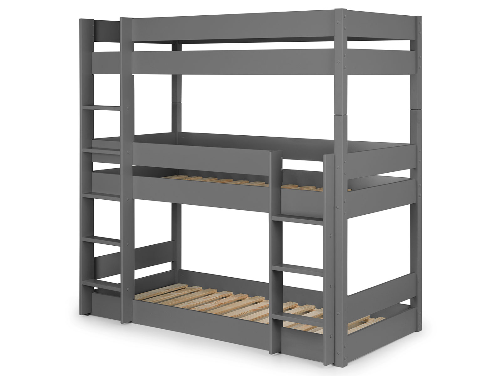 Accommodating 3 children whilst only using the space of one single bed, the Trio bunk bed is the perfect solution for those short on space in smaller bedrooms. Ideal for sleeping siblings, or regular sleepovers the durable Trio Bunk is finished in a stylish Surf anthracite, matching any bedroom decor. Crafted from solid pine and MDF, this safe and sturdy design is essential for maximising space.