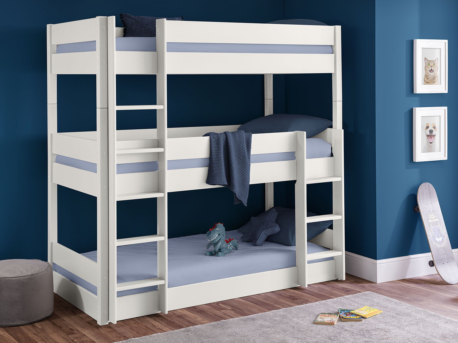 Accommodating 3 children whilst only using the space of one single bed, the Trio bunk bed is the perfect solution for those short on space in smaller bedrooms. Ideal for sleeping siblings, or regular sleepovers the durable Trio Bunk is finished in a stylish Surf anthracite, matching any bedroom decor. Crafted from solid pine and MDF, this safe and sturdy design is essential for maximising space.