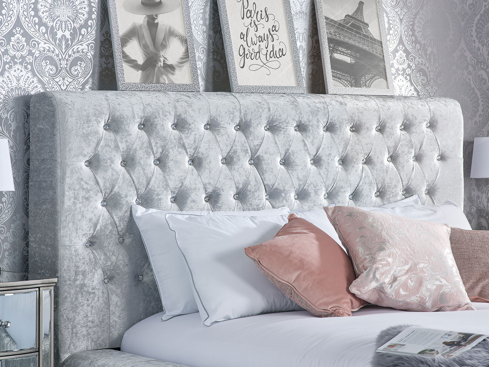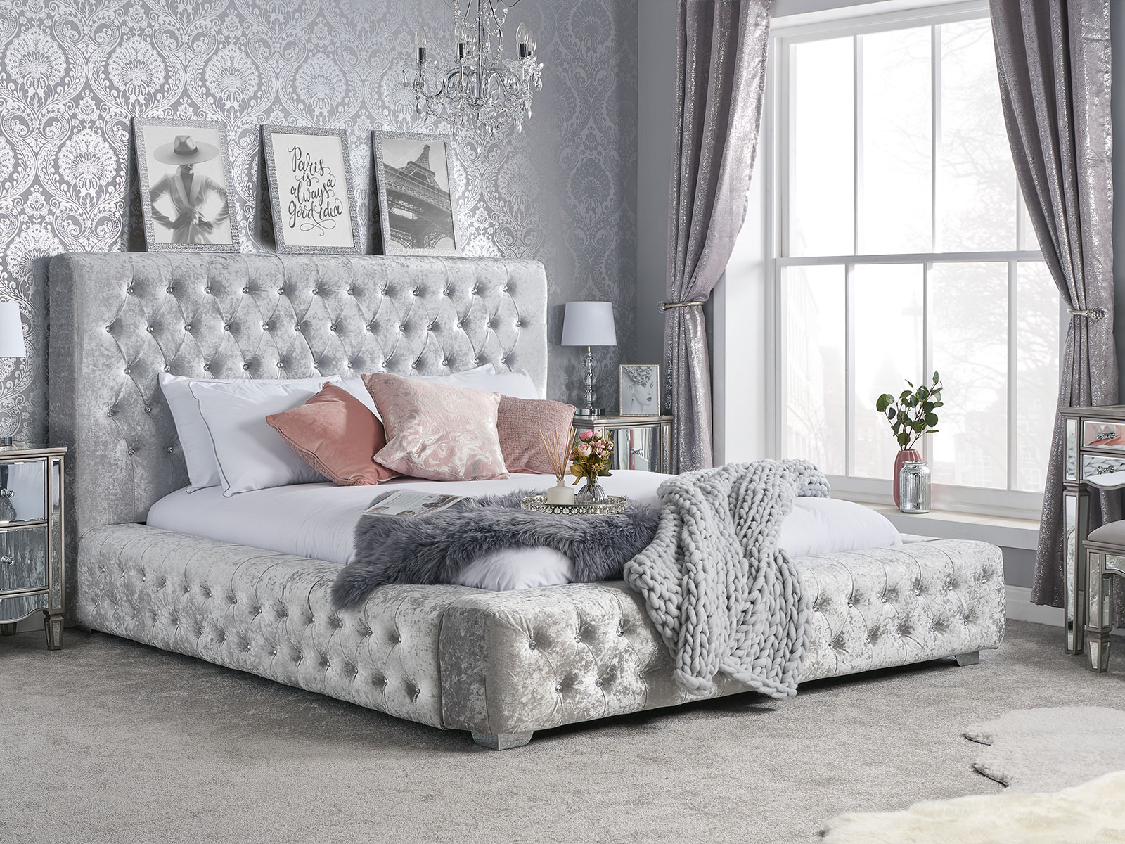 The Grande bed frame is upholstered in polyester with silver feet and comes in a beautiful crushed steel velvet.