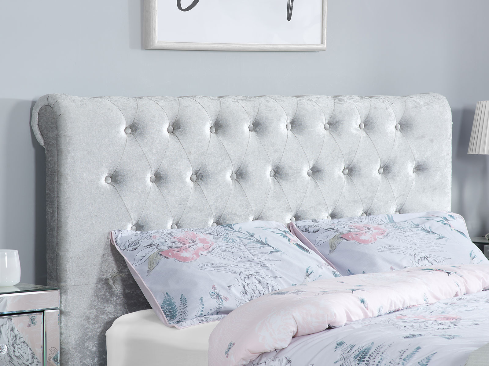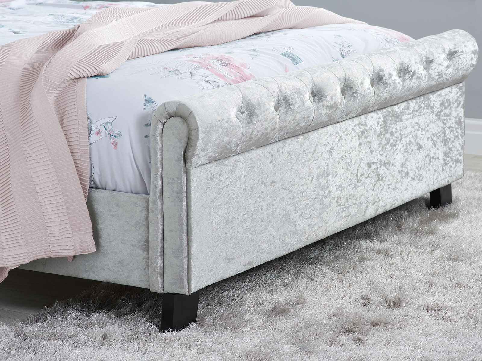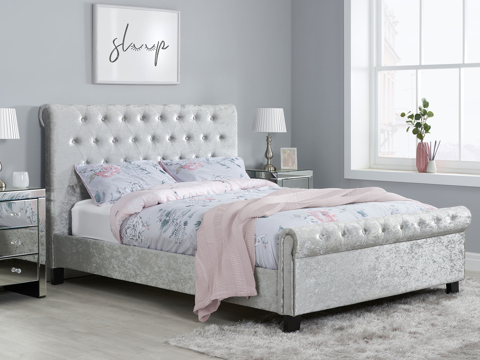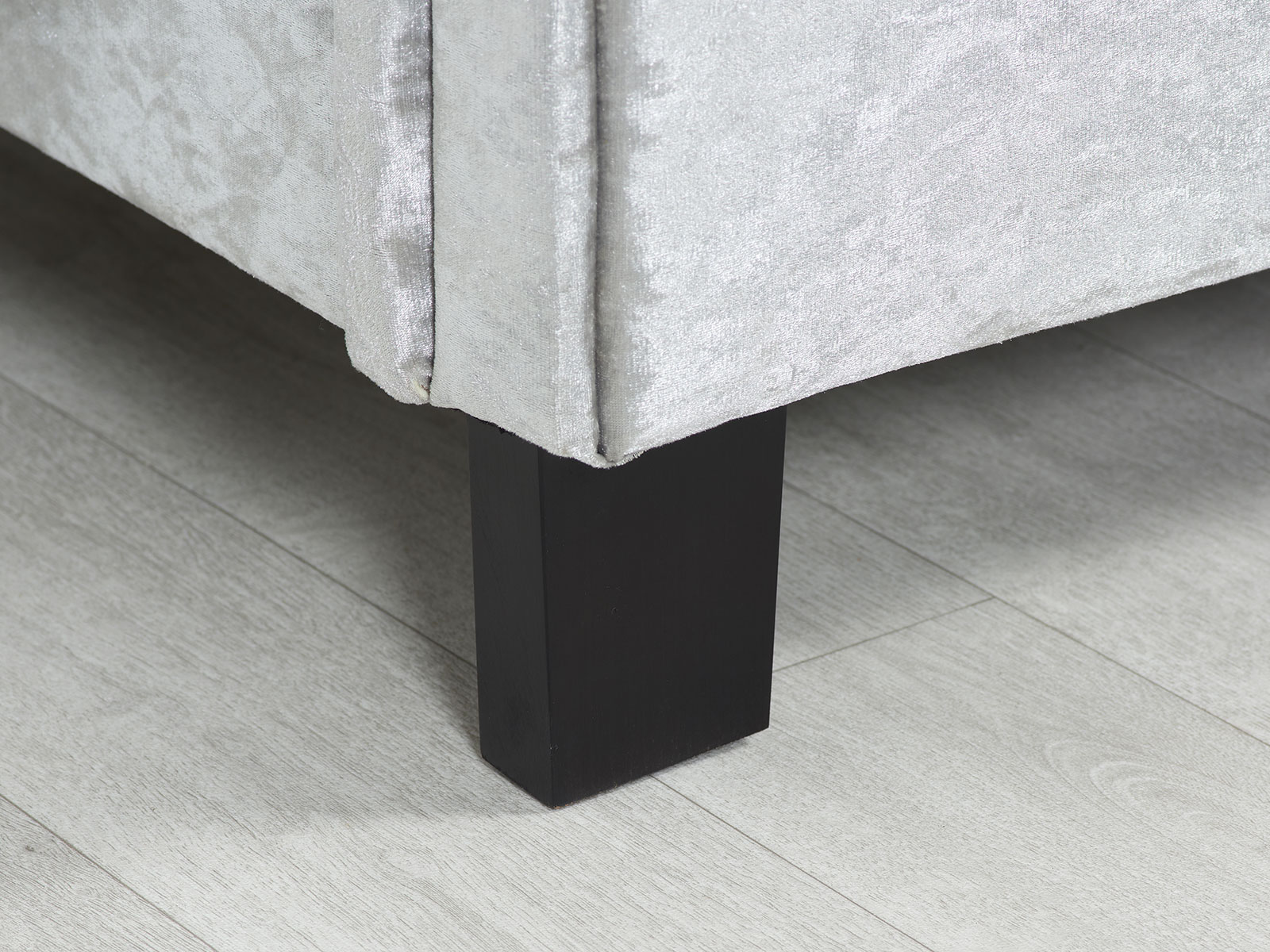 The Sienna bed frame is upholstered in polyester with complementary dark feet and comes in a beautiful crushed steel velvet.