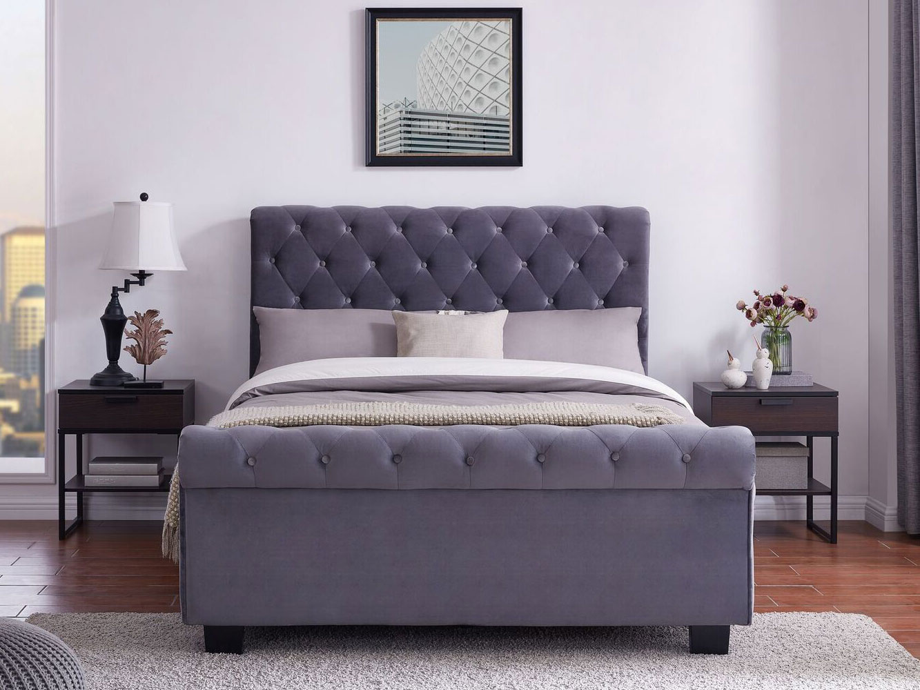 The Flintshire Furniture Whitford Fabric Side Ottoman Bed features a Chesterfield style, gently scrolled tall headboard and matching low footboard and upholstered in a sumptuous grey crushed velvet soft fabric.