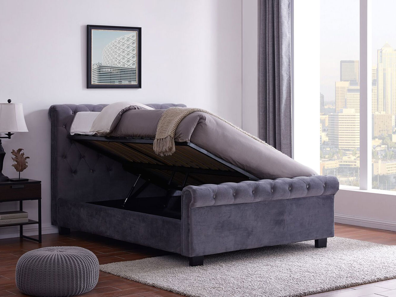 The powerful hydraulic-assisted lift-up mattress base features two rows of sprung slats for added comfort and allows you to access the under-bed storage. The lift up frame can be assembled to open from the left or right side of the bed frame to best suit your bedroom layout.