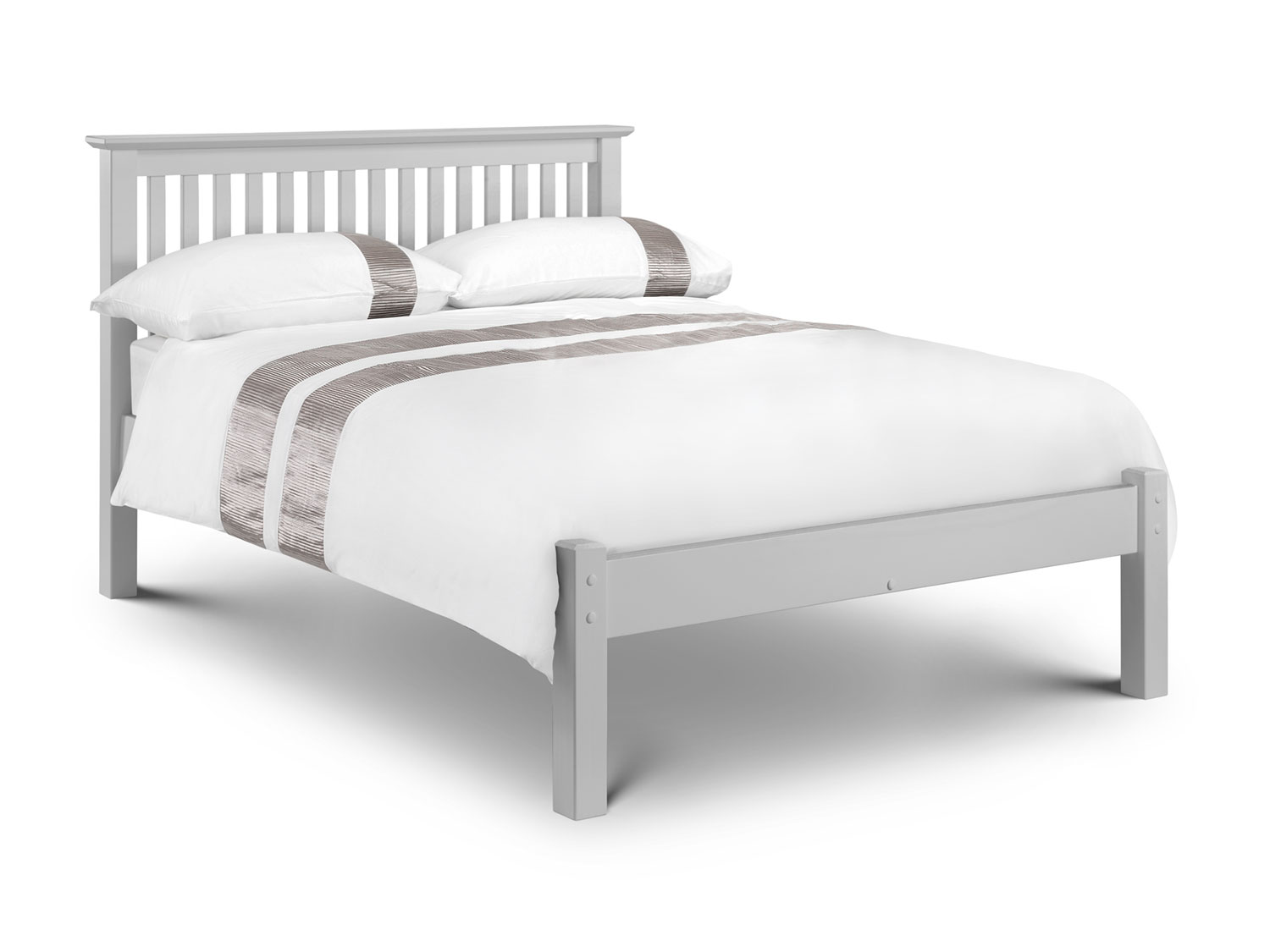 An imposing bed frame made from solid pine and MDF in an immaculate dove grey lacquered finish. Its timeless shaker style sits equally well alongside contemporary and traditional interiors. Substantial posts and capping combine with a solid pine slatted base to ensure an incredibly robust and durable bed frame.