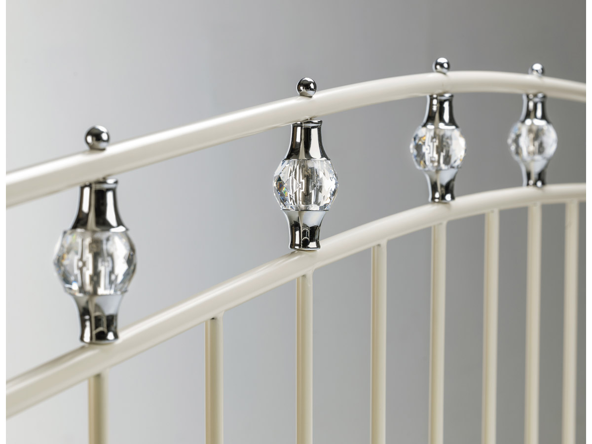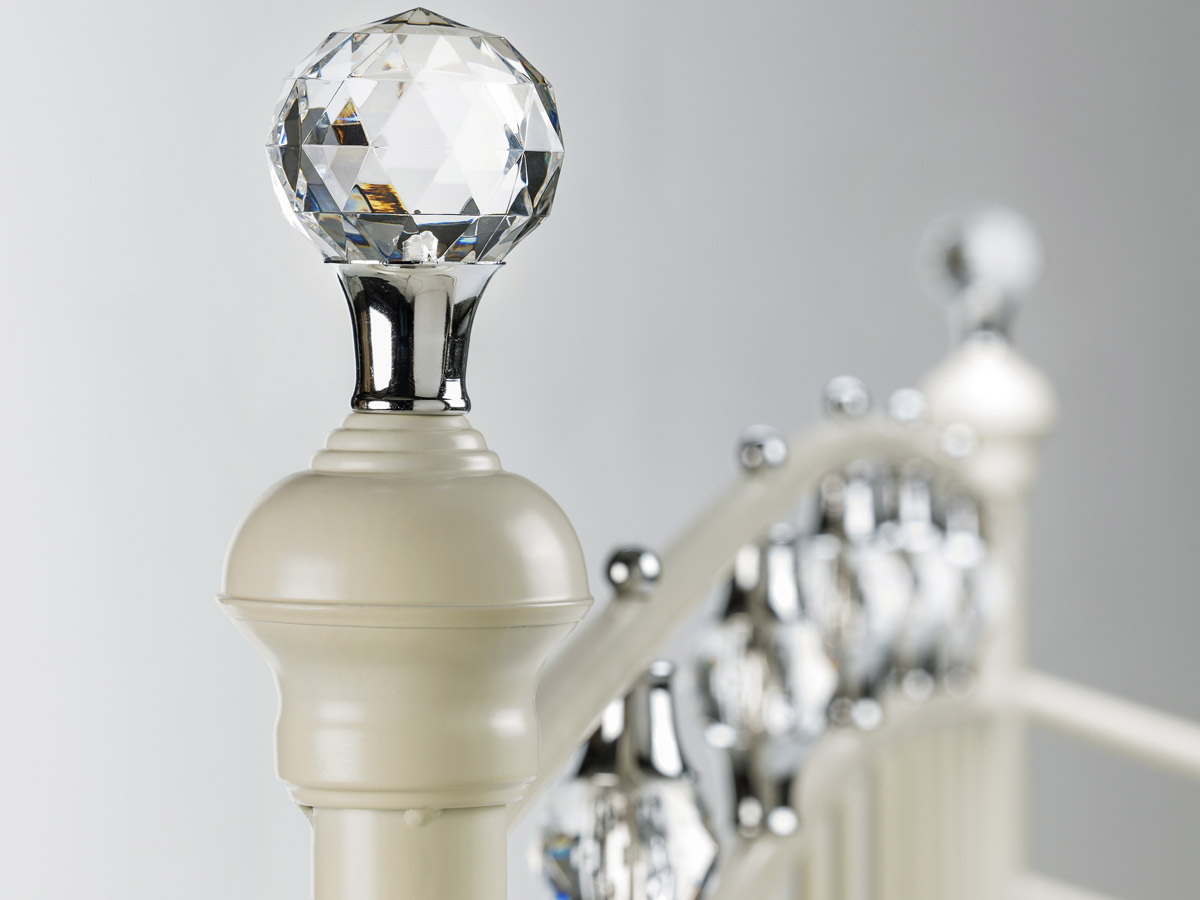 Our Exquisite Sophie Bed, finished in a Stone White finish, incorporates Luxurious Crystal Effect Finials and Chrome Detailing.