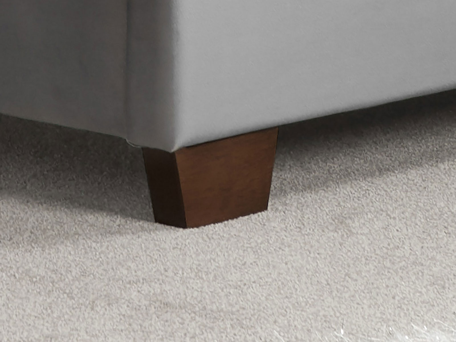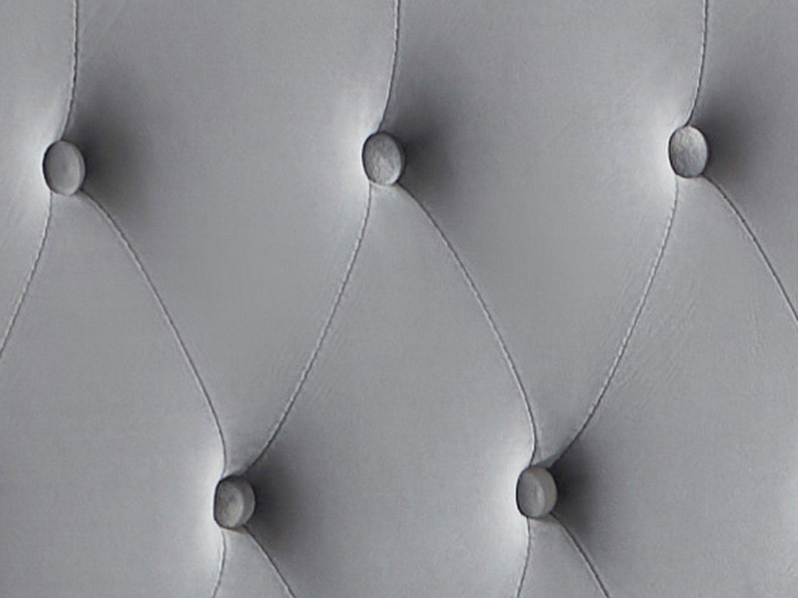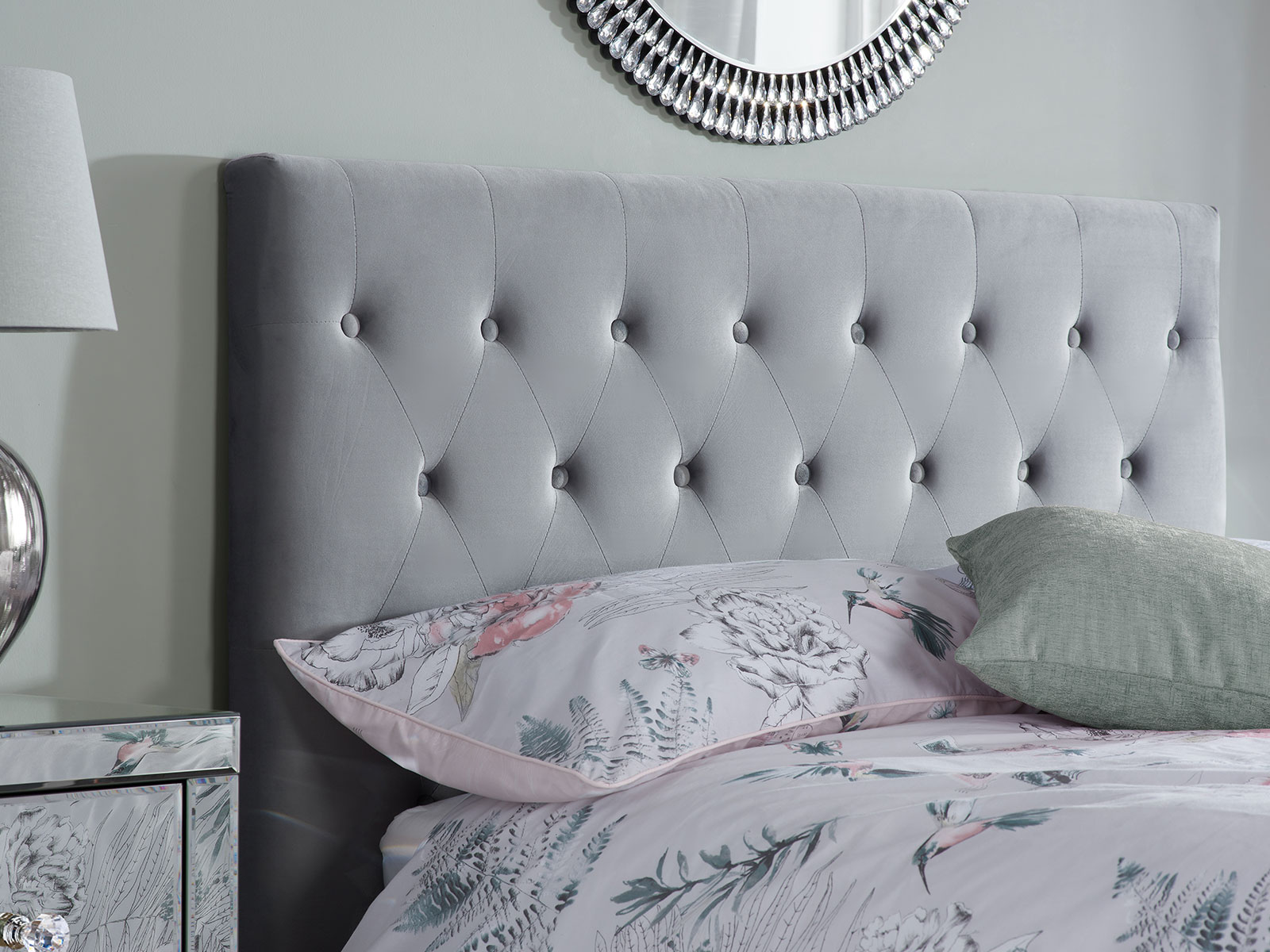 The Cologne bedstead is upholstered in either a steel crushed velvet or a grey fabric and features a striking buttoned headboard.