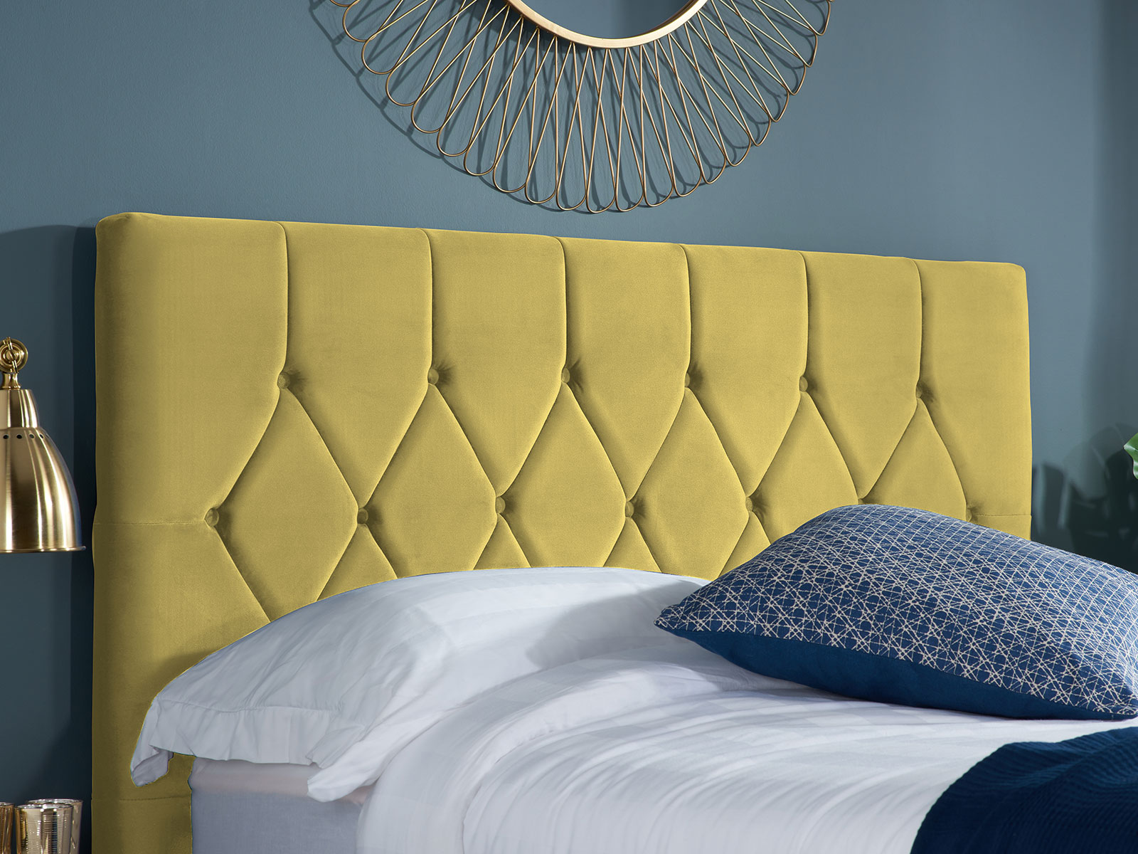 The Loxley bed frame is upholstered in polyester with complementary light feet and is available in mustard, grey, green and blue.