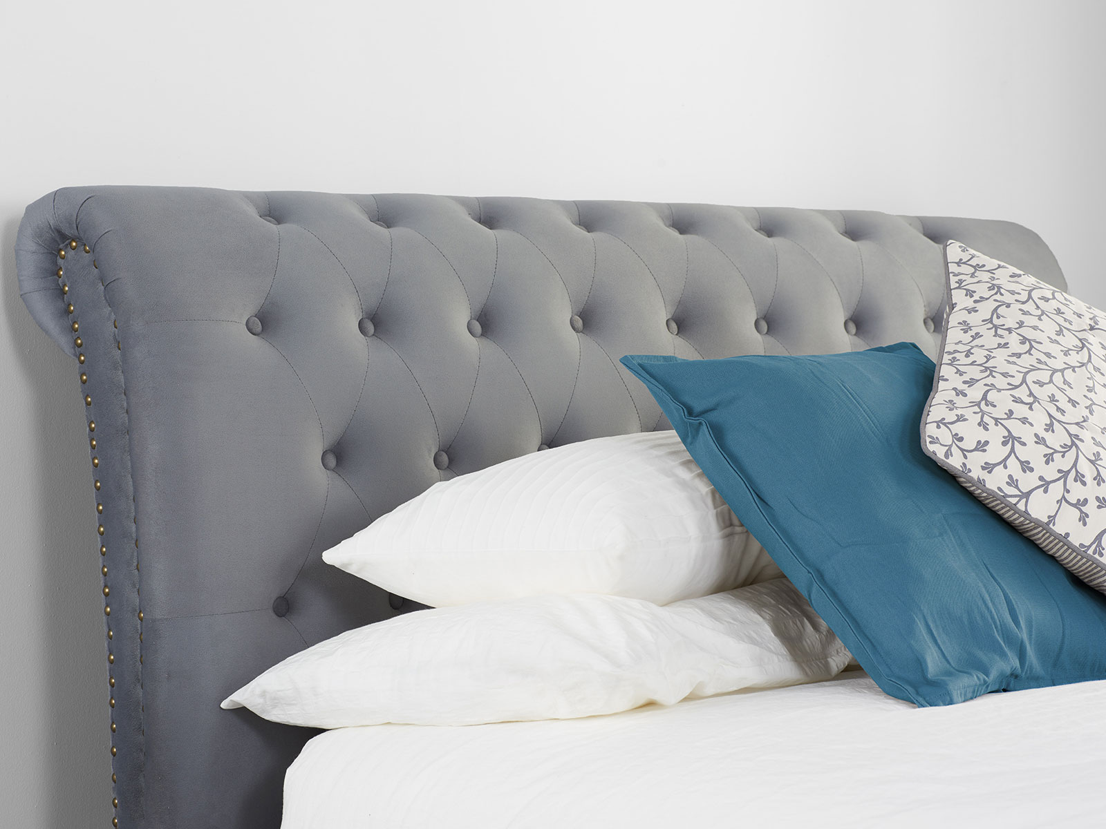 The perfect statement piece, Opulence exudes style with button detailing, metal studs and a striking roller head and footboard design.