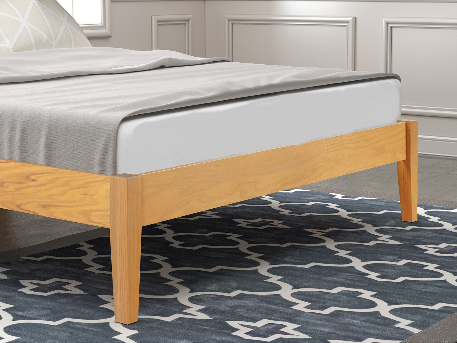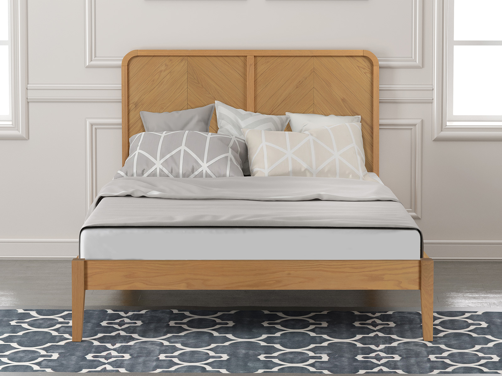 The Whelstone Bed Frame features a sophisticated solid paneled headboard, showcasing a stunning 2-panel design with diagonal oak panels. This meticulous attention to detail creates a visual masterpiece that effortlessly combines modern aesthetics with classic charm.