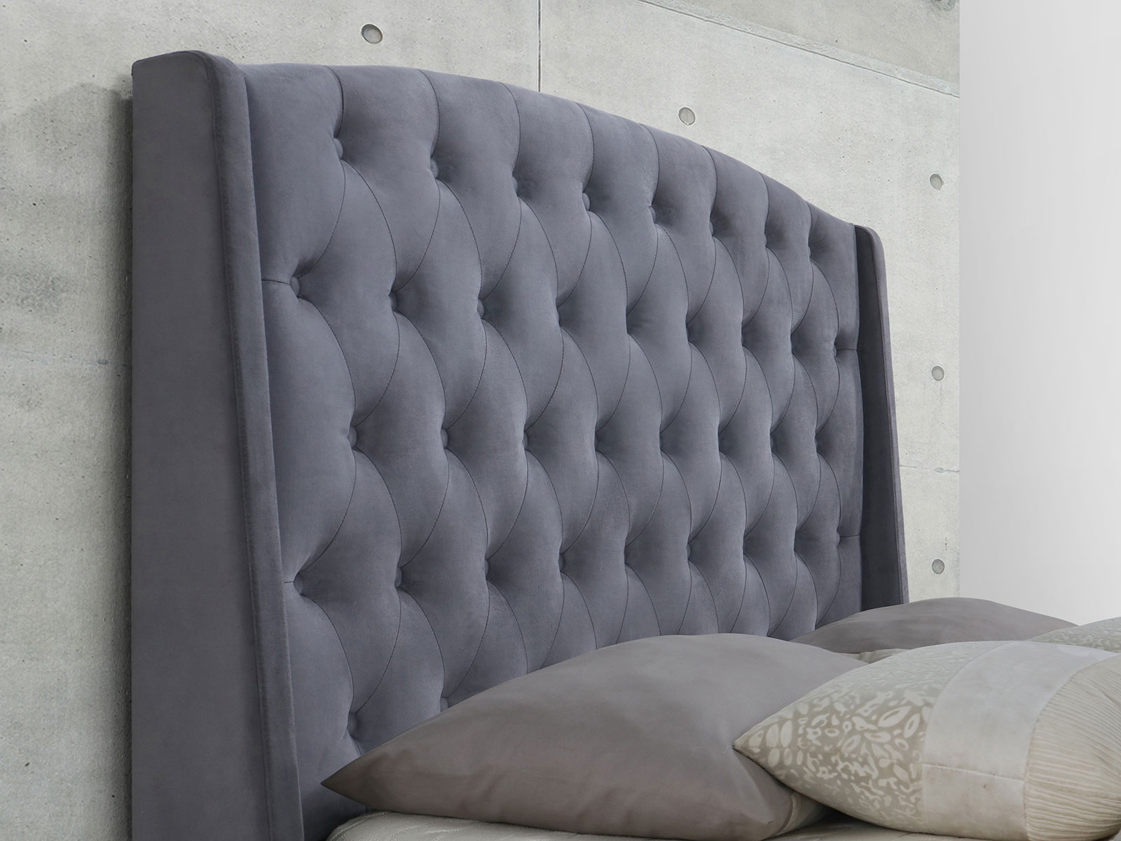 The Balmoral bed is upholstered in a luxurious grey velvet and features a wingback headboard with beautiful tufted detailing.