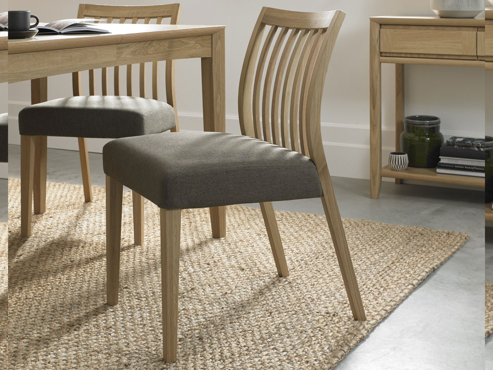 Bergen is a strikingly contemporary, modular-based collection of dining, living room & home office furniture that offers flexibility and practicality in tune with today’s lifestyles. Made with a combination of attractive grey washed oak tops contrasting with soft grey pigment frames, this range is hugely versatile, offering three sizes of tables, ultramodern low back slat and upholstered chairs as well as a more standard high back slat chair, in fabric or faux leather options. The design features curved tapering legs that meet the patterned tops in a three way mitre joint, boasting a real technical prowess by way of precise CNC machining, neat finishes and general technical excellence to create a complex simplicity! Inspired by the needs of open plan living, it allows you to create functional combinations of shelf units and cabinet pieces that fIt’seamlessly within dining, lounge or home office settings. The Bergen collection is the perfect solution for the demands of modern-day living.