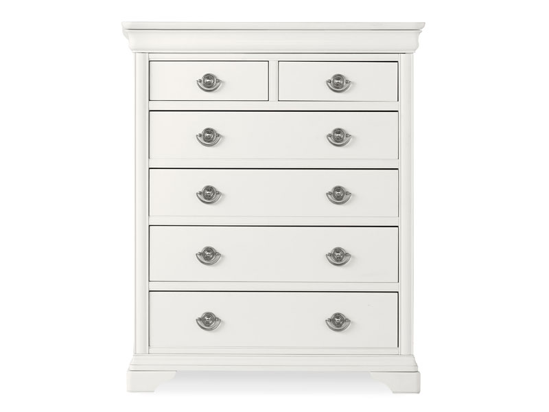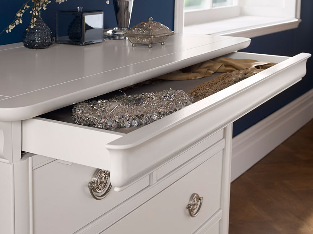 The Chantilly White bedroom collection is crafted from white painted American poplar solids and veneers and offers a contemporary update to classic French styling. Chantilly effortlessly combines a bold character with subtle attention to detail that results in a range that is, quite simply, beautiful. Intricate details such as a curved crest rail on the bed and bespoke shield handles contribute to the beauty of this range, while surprising features such as hidden drawers and soft-closing runners allow for a superior user experience. Chantilly is an exquisitely grand range that will add an opulent touch to any bedroom