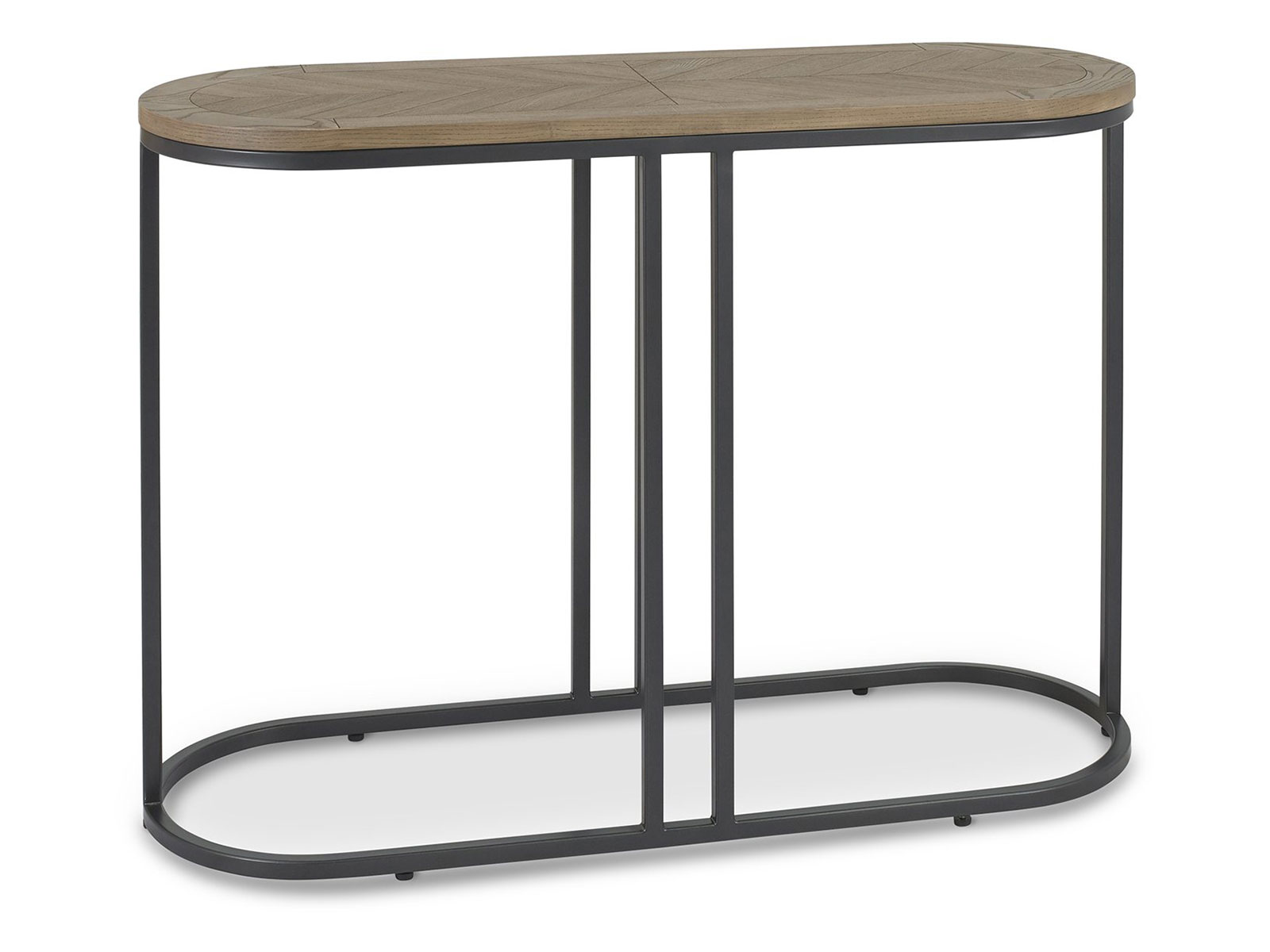 A bold and contemporary design that contrasts saw cut ash marquetry tops in a weathered finish with a fully welded black powder coated metal base, giving the range an on trend industrial look. Each of the hand-crafted boarded chevron patterned tops are wire brushed and distressed to give a rustic look and tactile feel, making the most of the beautiful and varied grains of ash. The radiused tops and bases combine beautifully with the linear frames to make a statement in any setting.
