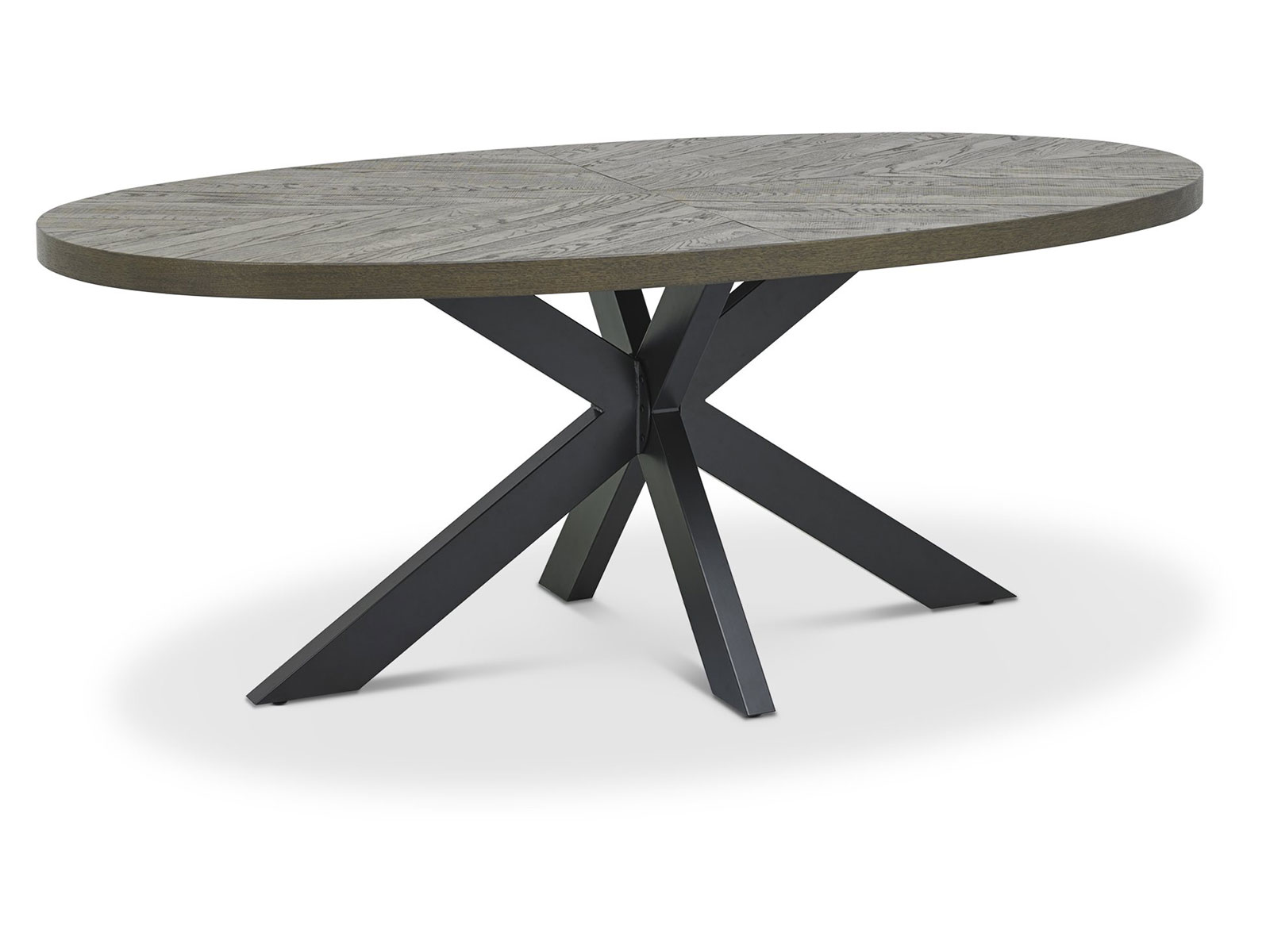 Ellipse Fumed Oak showcases bold design with a combination of the natural lines of the elliptical and circular tables, paired with the geometrical & linear shapes of the cabinet, to create a compelling and slightly eclectic look. The striking saw cut fumed rustic oak marquetry tops on the thick table tops and cabinet doors contrast beautifully against the large welded peppercorn powder coated metal bases, creating a range that successfully blends intricate craftsmanship and indulgently warm tones with an on trend industrial aesthetic. Each of these hand-crafted pattern tops and laminated fumed rustic oak cabinet frames are wire brushed and distressed to give a rustic look and tactile feel, making the most of the beautiful and varied grain of oak. Generously proportioned dining chairs, styled with diamond stitch upholstery in a choice of luxurious dark grey fabric and old west vintage bonded leather, feature plush padded seats, gently flared backs and elegantly tapering legs, imbuing comfort and indulgence. Superior Blum soft close drawer runners add that final quality detail to a range that is sure to be a focal point in any space.
