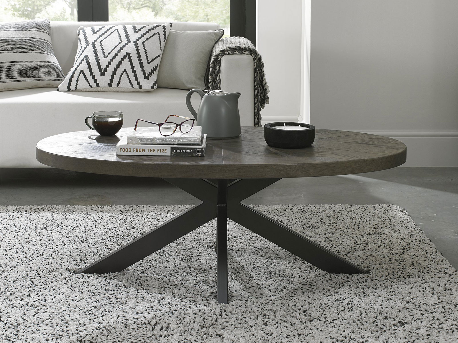 Ellipse Fumed Oak showcases bold design with a combination of the natural lines of the elliptical and circular tables, paired with the geometrical & linear shapes of the cabinet, to create a compelling and slightly eclectic look. The striking saw cut fumed rustic oak marquetry tops on the thick table tops and cabinet doors contrast beautifully against the large welded peppercorn powder coated metal bases, creating a range that successfully blends intricate craftsmanship and indulgently warm tones with an on trend industrial aesthetic. Each of these hand-crafted pattern tops and laminated fumed rustic oak cabinet frames are wire brushed and distressed to give a rustic look and tactile feel, making the most of the beautiful and varied grain of oak. Generously proportioned dining chairs, styled with diamond stitch upholstery in a choice of luxurious dark grey fabric and old west vintage bonded leather, feature plush padded seats, gently flared backs and elegantly tapering legs, imbuing comfort and indulgence. Superior Blum soft close drawer runners add that final quality detail to a range that is sure to be a focal point in any space.