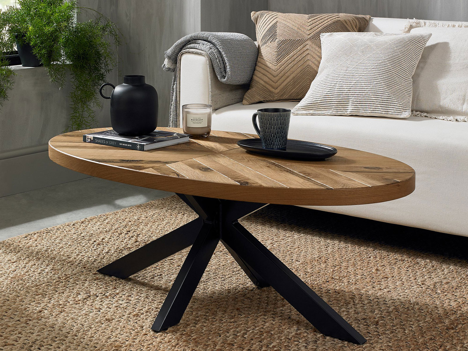 Ellipse Rustic Oak showcases bold design with a combination of the natural lines of the elliptical and circular tables, paired with the geometrical & linear shapes of the cabinet, to create a compelling and slightly eclectic look. The striking saw cut rustic oak marquetry tops on the thick table tops and cabinet doors contrast beautifully against the large welded peppercorn powder coated metal bases, creating a range that successfully blends intricate craftsmanship and indulgently warm tones with an on trend industrial aesthetic. Each of these hand-crafted pattern tops and laminated rustic oak cabinet frames are wire brushed and distressed to give a rustic look and tactile feel, making the most of the beautiful and varied grain of oak. Generously proportioned dining chairs, styled with diamond stitch upholstery in a choice of luxurious dark grey fabric and old west vintage bonded leather, feature plush padded seats, gently flared backs and elegantly tapering legs, imbuing comfort and indulgence. Superior Blum soft close drawer runners add that final quality detail to a range that is sure to be a focal point in any space.