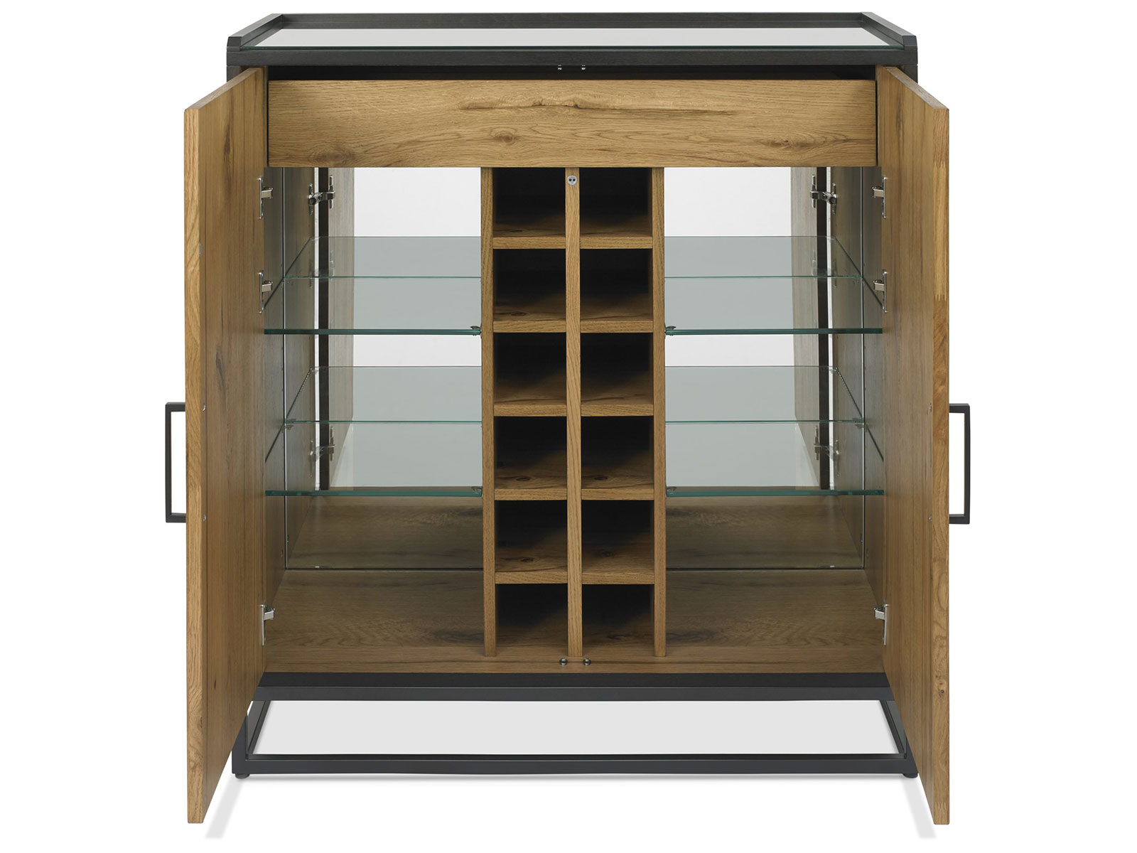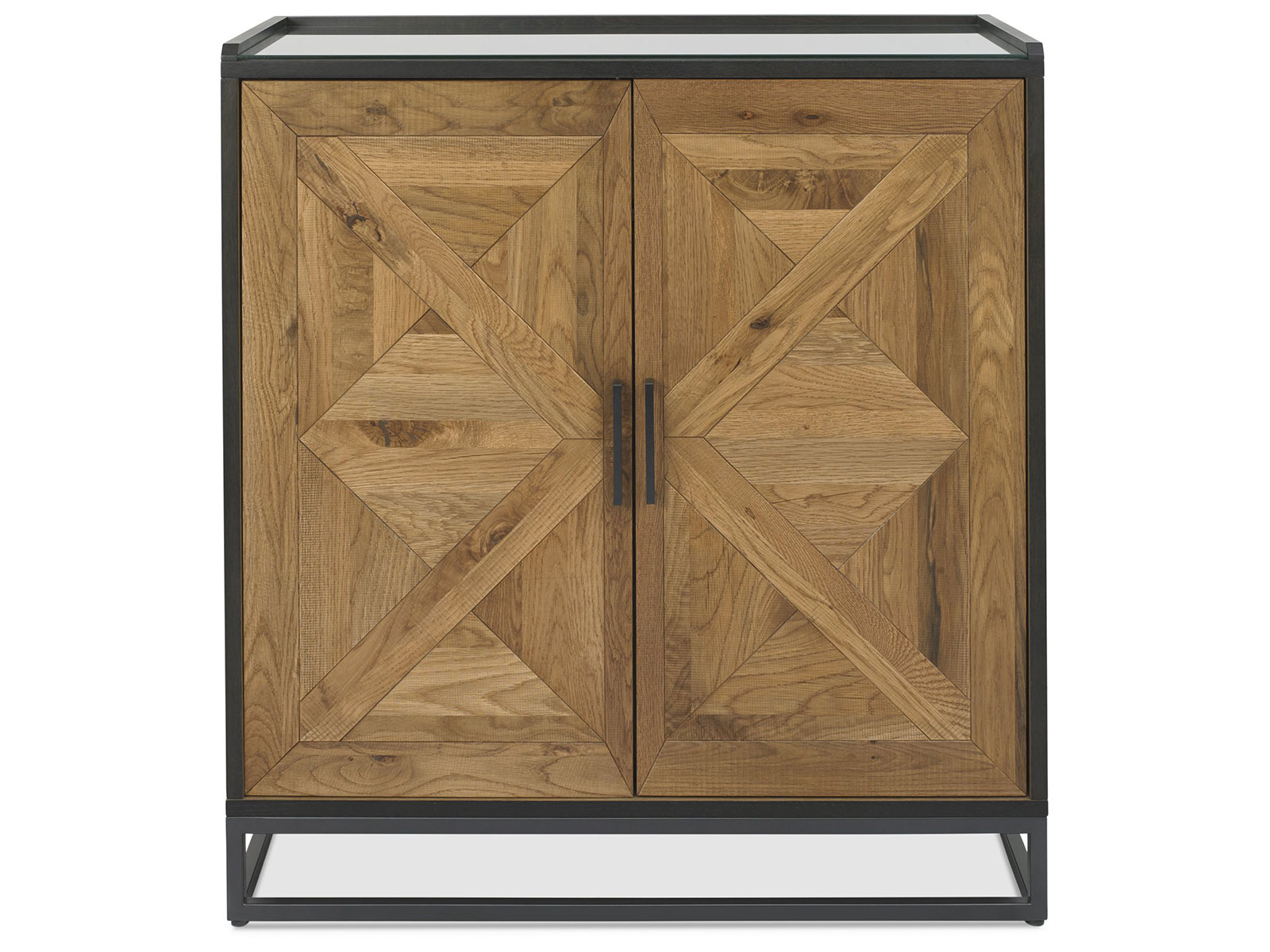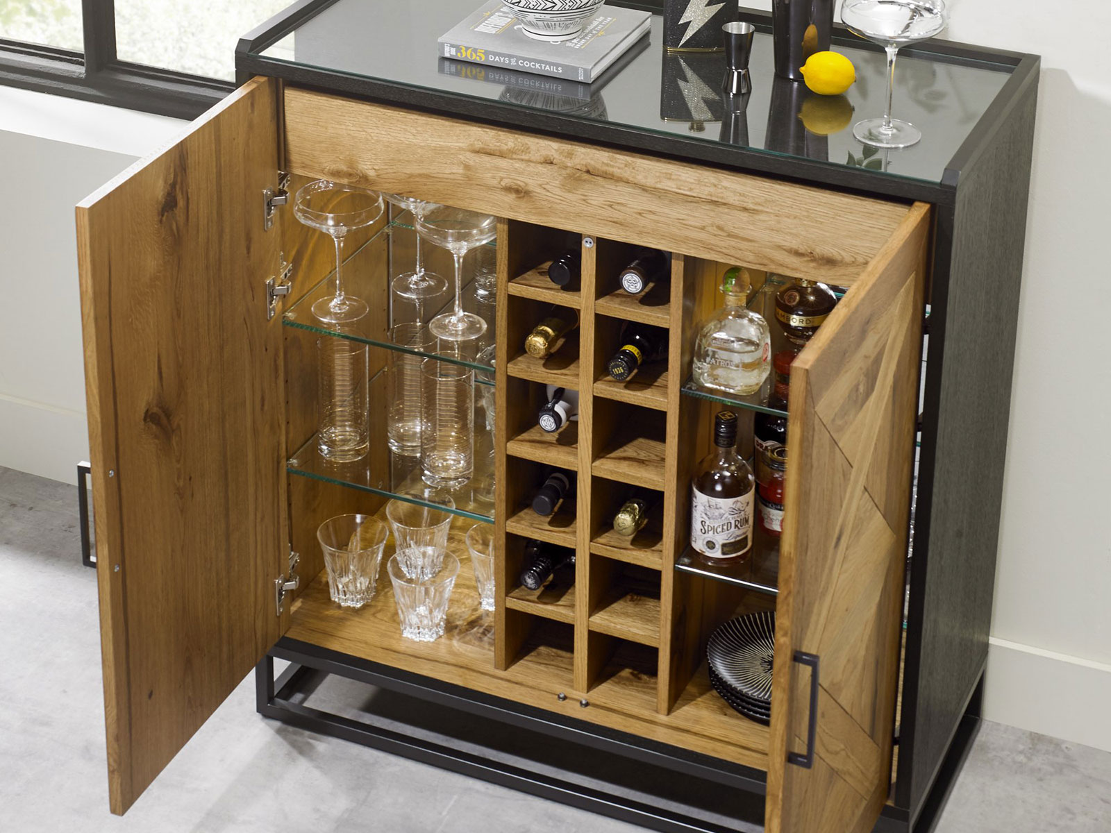Indus is a striking design combining saw cut oak marquetry tops with a ‘peppercorn’ finished wire brushed oak veneered frame and a welded black powder coated metal base, giving it an on trend industrial edge. Each of the hand-crafted pattern tops are wire brushed and distressed to give a rustic look and tactile feel, making the most of the beautiful and varied grain of oak. Choose from generously proportioned oak upholstered chairs in four velvet options or a mottled grey fabric or cantilever chairs that feature this same fabric in a bold square pattern stitch detail with a handle in the back and superior glides on the base for ease of manoeuvre. BLUM soft closing hidden drawers within the sideboard cabinets add that extra refinement to the range in what will create a stunning focal point in any dining room.
