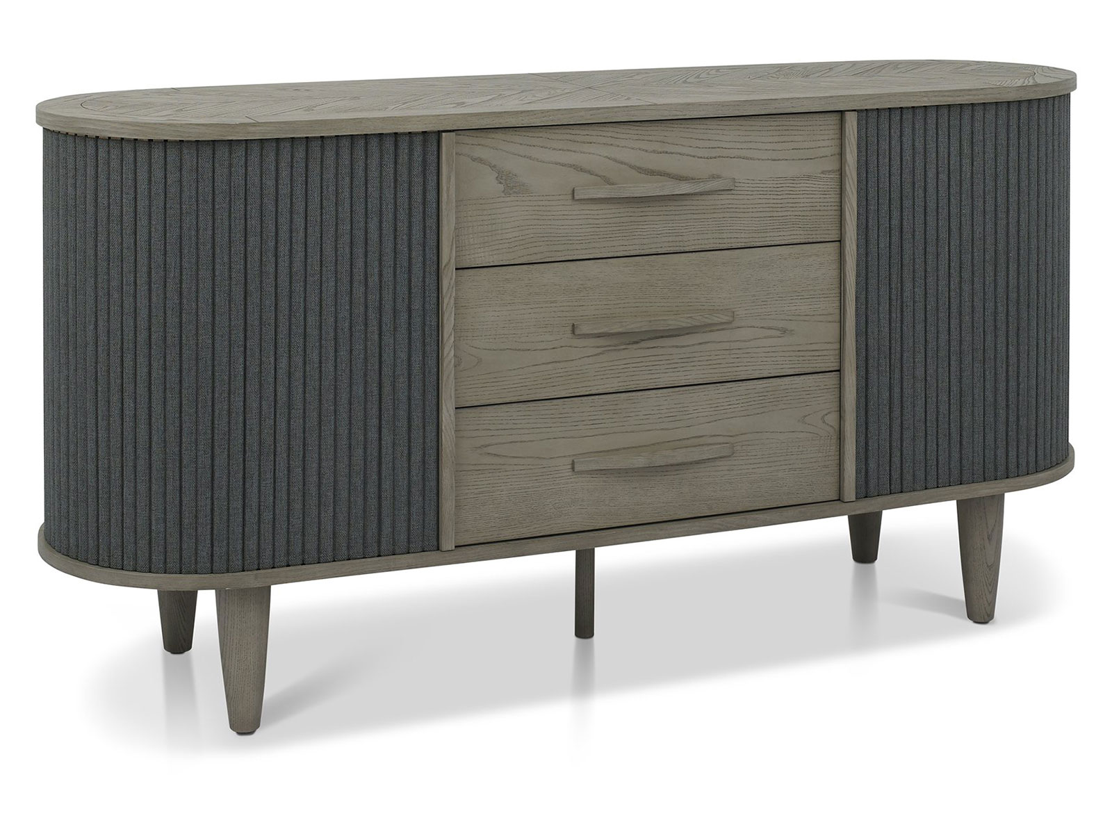 Monroe Silver Grey dining combines classic and contemporary styling to create timeless statement pieces for any home. Comprising of circular and lozenge-shaped forms, this range highlights on-trend, organic and flowing designs that provide a calming feel with softened edges and curves. This aesthetic is accentuated with saw-cut ash chevron pattern on the tables, cabinet tops and display unit which are finished in a fresh silver grey, and accompanied with matching turned tapering legs or contrasted with peppercorn powder coated metal frames. Slate grey fabric upholstered dining chairs and tambour doors complement this palette choice and add texture to pieces such as the sideboard and open display unit, whilst quality touches such as soft-closing runners speak to the craftsmanship and refinement of Monroe.
