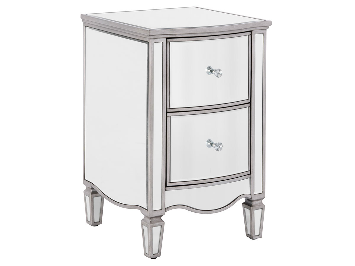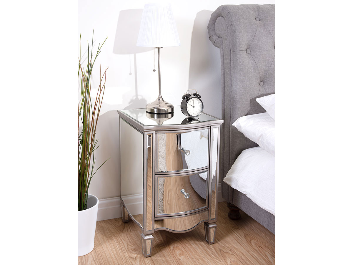 Elegantly made this 2 drawer bedside table is crafted in a clean, detailed design with a beautiful glass mirrored finish to provide a sense of space and light even in the dullest of rooms.