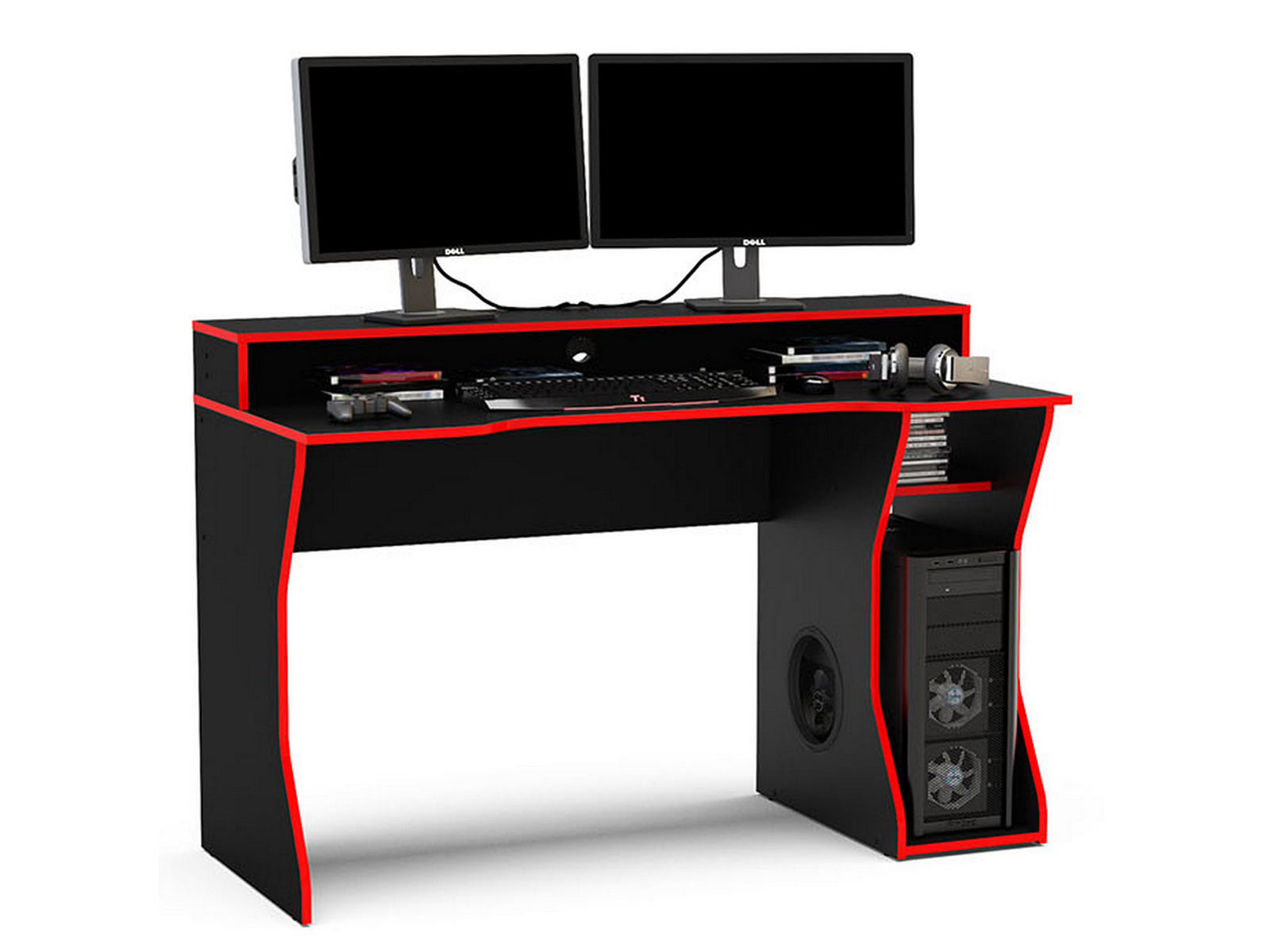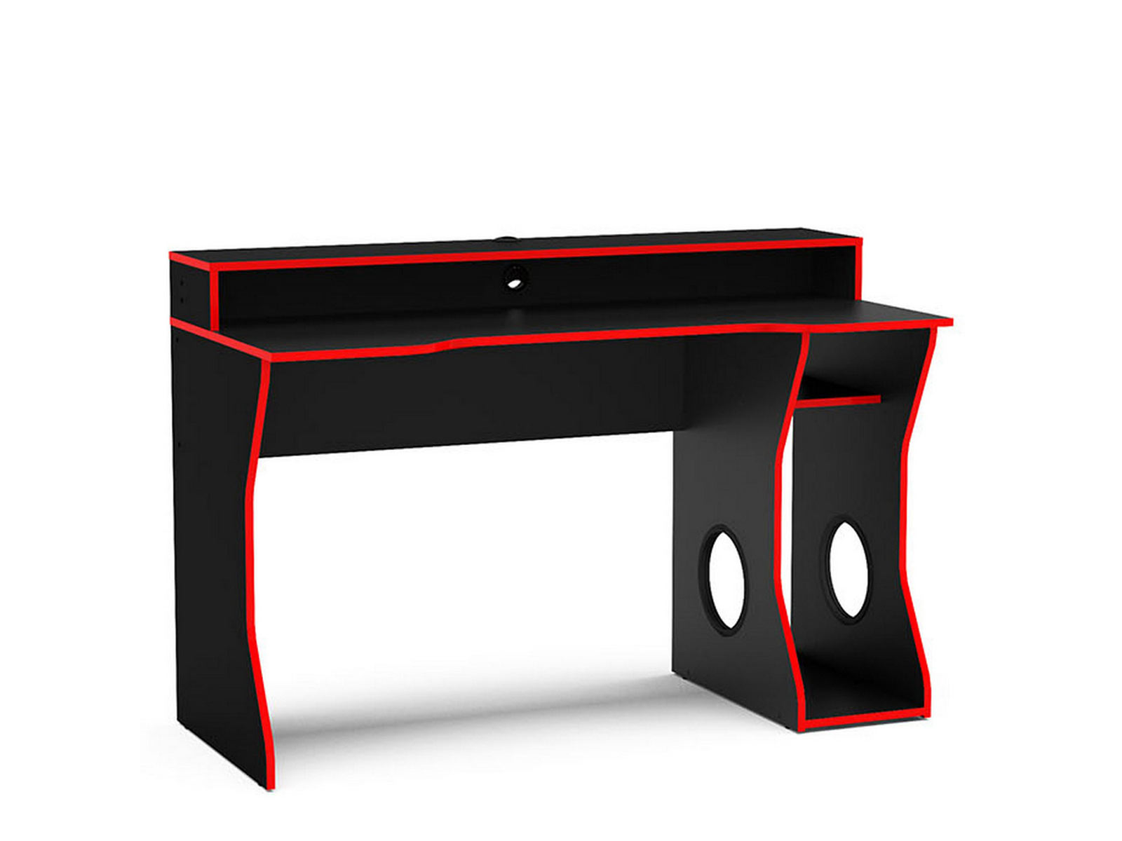 The Enzo gaming computer desk has been made with gamers fully in mind! It has everything a busy gamer could need. Featuring a large top shelf big enough for two large monitors and a generously sized ergonomic desk below suitable for the keyboard, mouse, controllers, games and more. The base of the desk features a computer store away with a ventilation hole and small shelf for games or controllers. This modern looking gaming computer desk is finished in black with a dark red trim making it a stunning addition to any home or office. Care instructions: Wipe carefully with a soft, dry cloth.