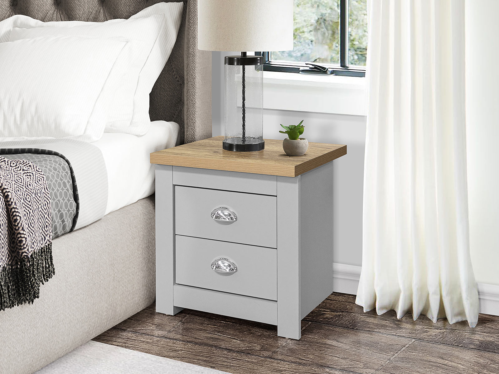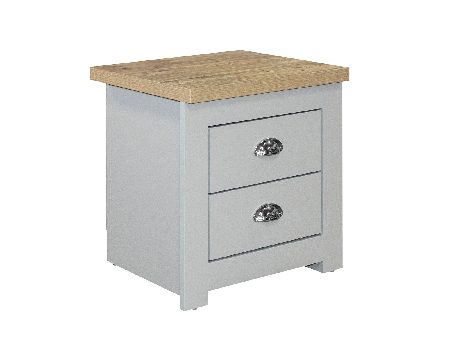 The Highgate 2 drawer bedside features 2 handy drawers ideal for storing away any belongings. The drawers are finished off with beautiful silver cup handles.