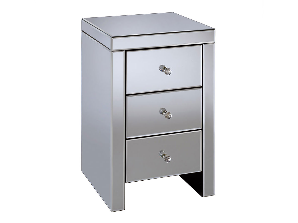 Constructed from a MDF frame this 3 drawer bedside features beautiful bevelled edges along with mock crystal handles.