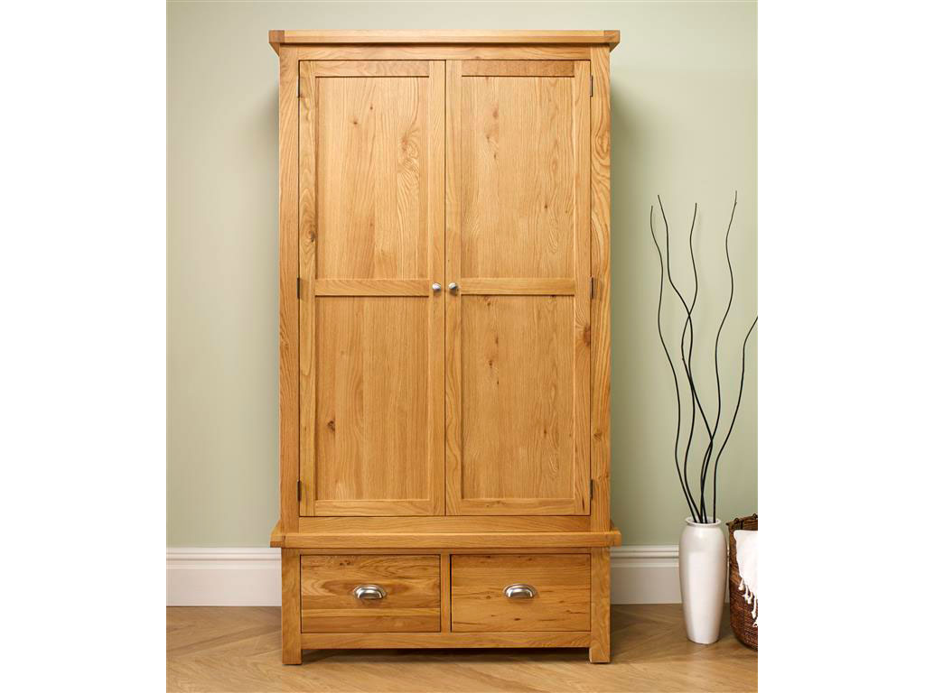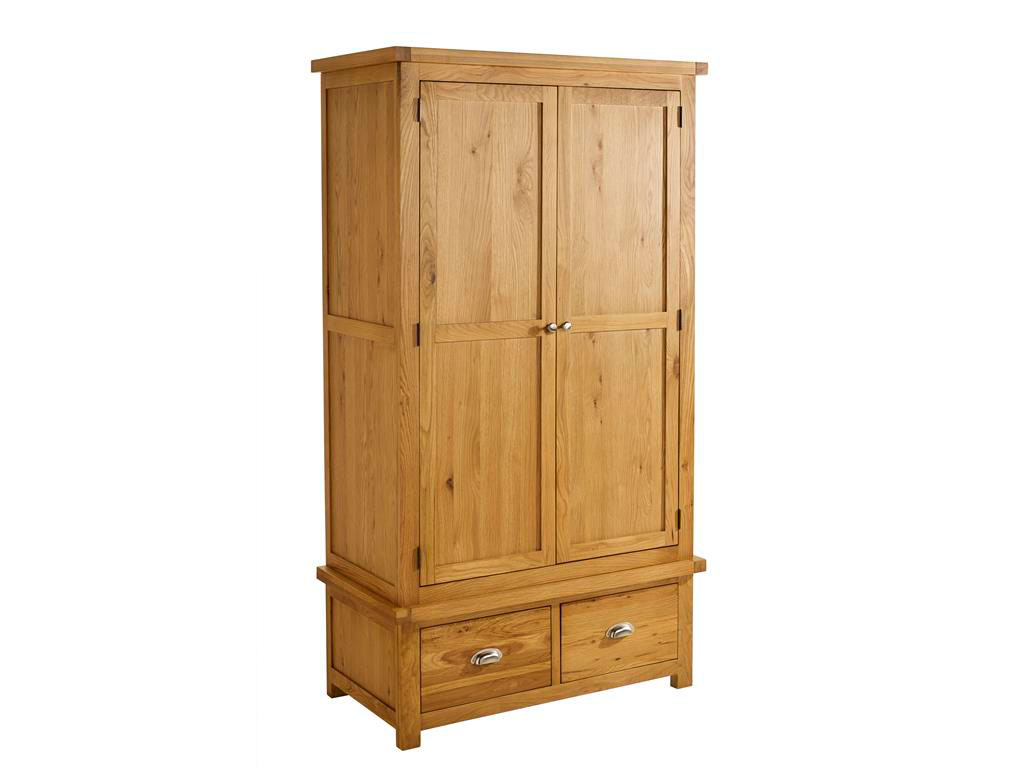 This practical wardrobe is spacious behind sturdy oak double doors, including two bottom drawers, perfect for the additional storage you need.