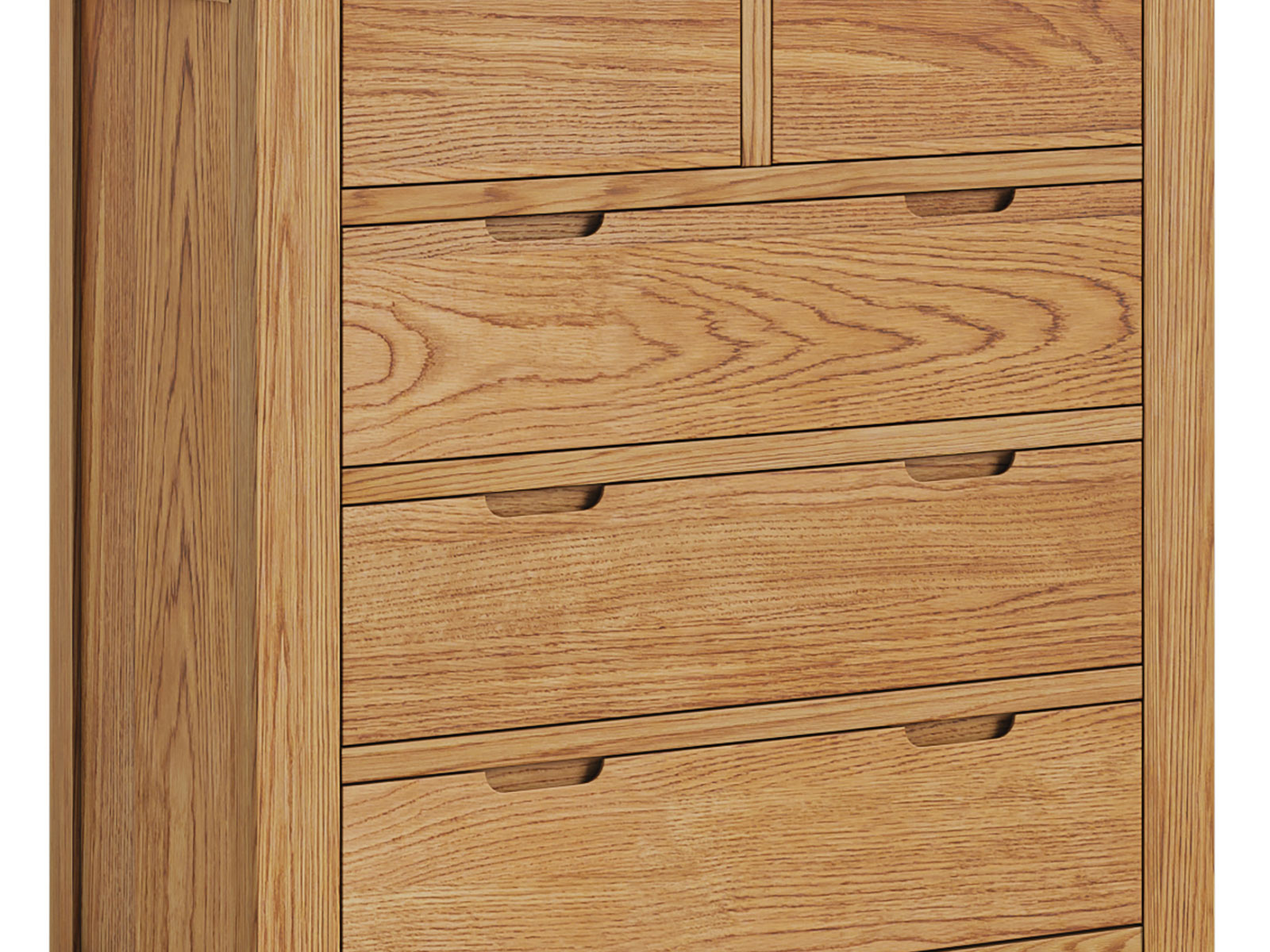 Bergen is beautifully made from solid Oak and Oak veneers. The collection showcases many unique features including inset handles, soft rounded corners and exaggerated exposed wood grain.