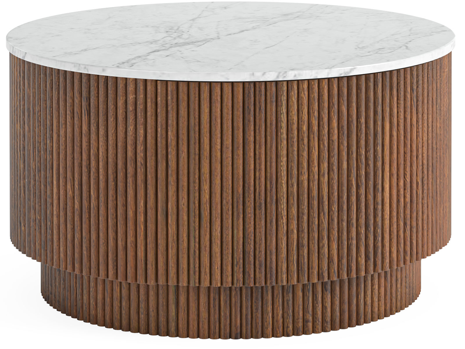 The Harvard range accentuates its racetrack curves with dynamic ribbing. Multiple finishes provide harmonious contrast, tinting the solid mango to a warm coffee bean finish & leaving the marble top a natural hue. A brass-finished base elevates the sideboard with round legs to complement the rounded silhouette. A push on the seamlessly integrated doors opens to inner storage to shelves.