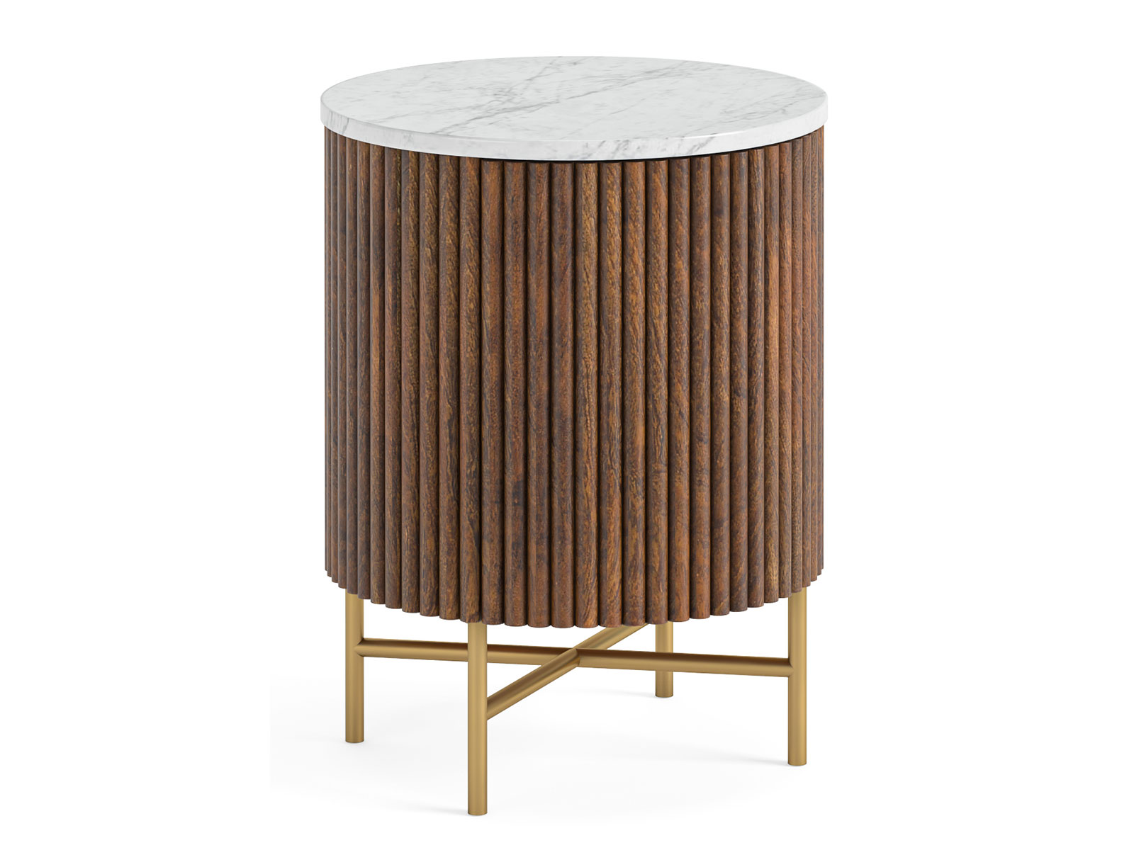The Harvard range accentuates its racetrack curves with dynamic ribbing. Multiple finishes provide harmonious contrast, tinting the solid mango to a warm coffee bean finish & leaving the marble top a natural hue. A brass-finished base elevates the sideboard with round legs to complement the rounded silhouette. A push on the seamlessly integrated doors opens to inner storage to shelves.