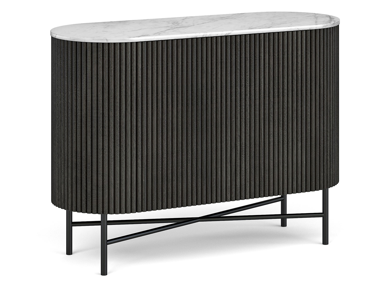 The Lucas range accentuates its racetrack curves with dynamic ribbing. Multiple finishes provide harmonious contrast, tinting the solid mango charcoal and leaving the marble top a natural hue. A black-finished base elevates the sideboard with round legs to complement the rounded silhouette. A push on the seamlessly integrated doors opens to inner storage to shelves.
