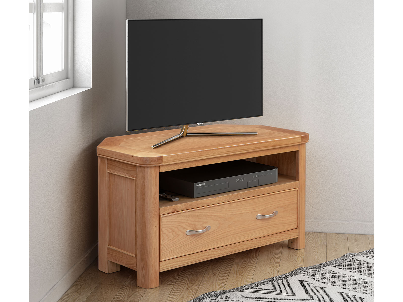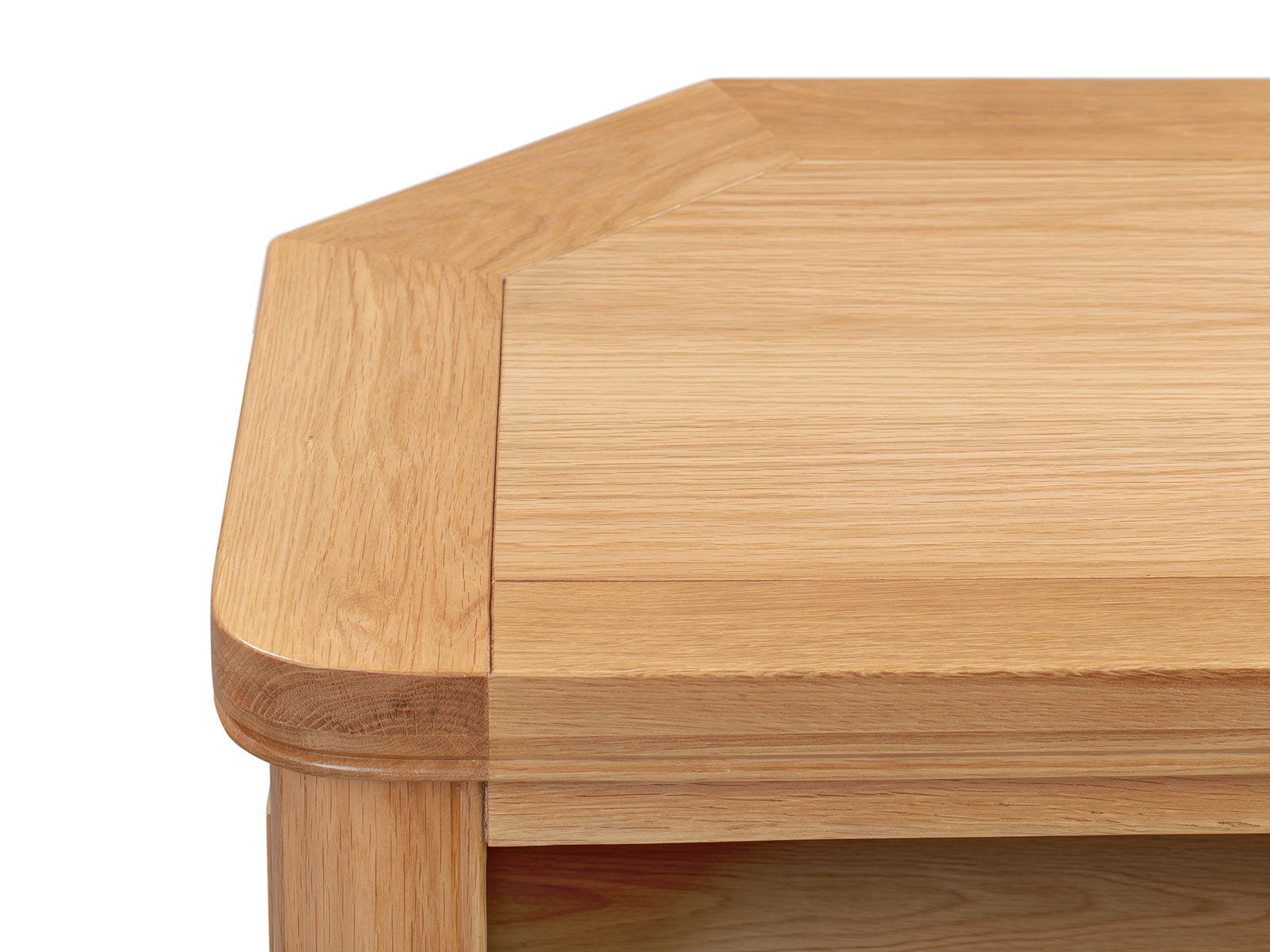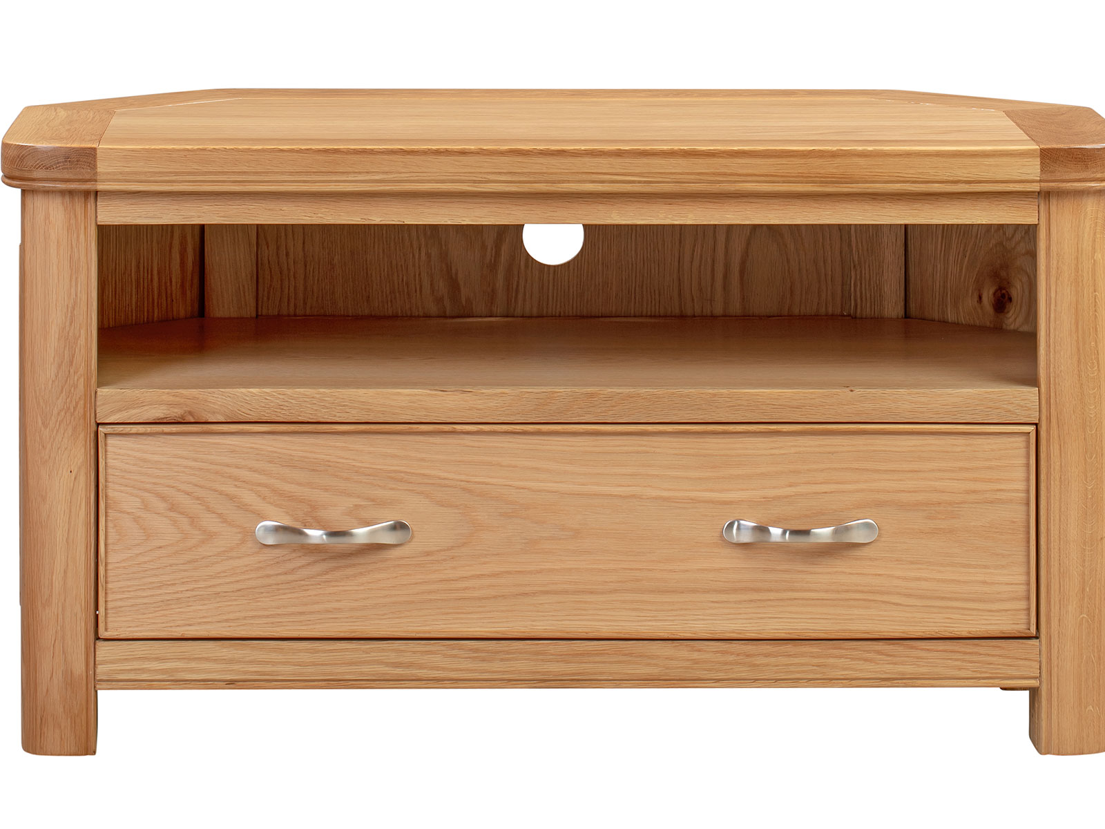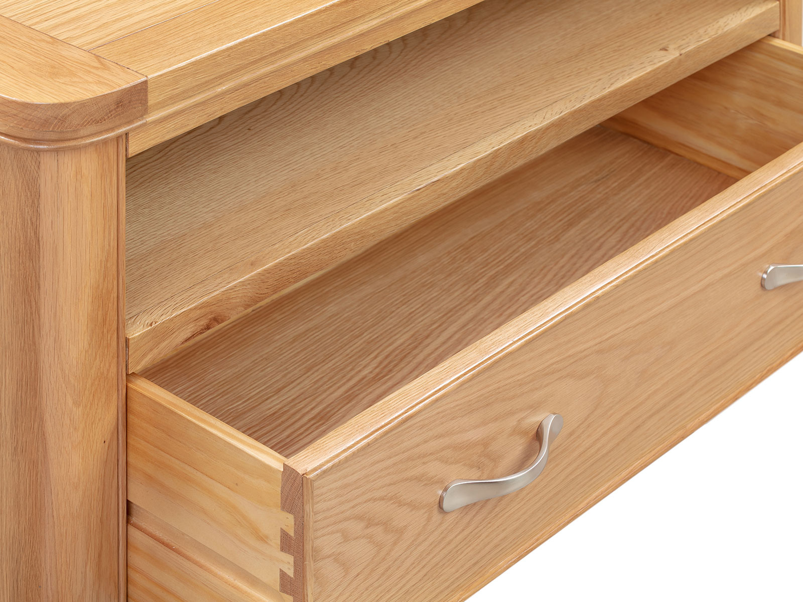 The Blenheim Oak Range of furniture is characterised by curved edges, classic moulding and a contemporary stainless steel handle. Blenheim Oak is finished in a natural colour with a clear lacquer.