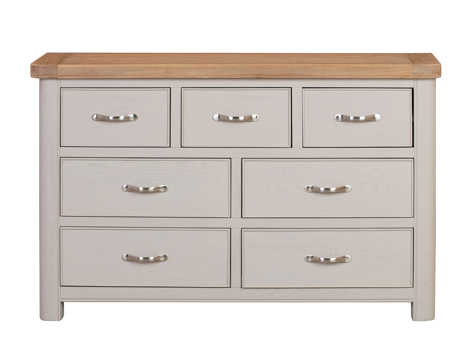 The Furniture Mill Blenheim Range of furniture is characterised by curved edges, classic moulding and a contemporary stainless steel handle. Blenheim Painted has washed oak tops with bases and legs finished in a putty grey, highlighting the natural oak grain underneath.