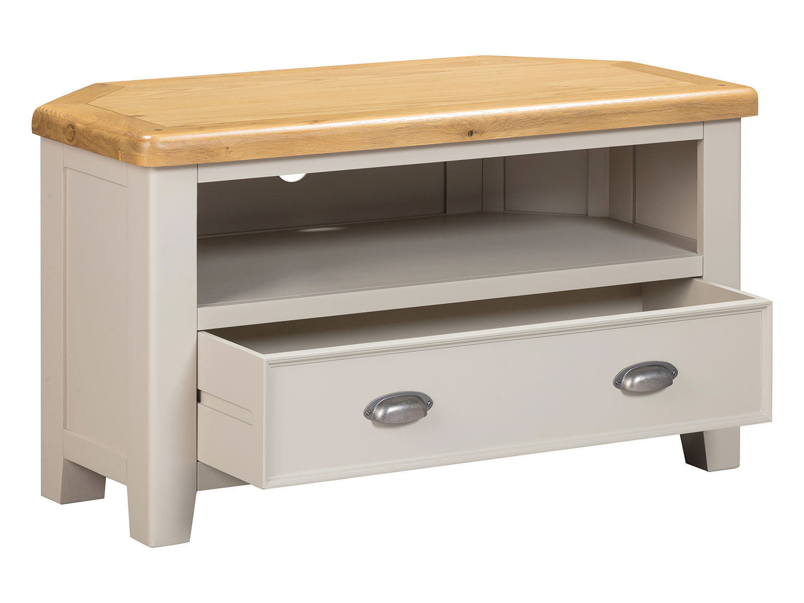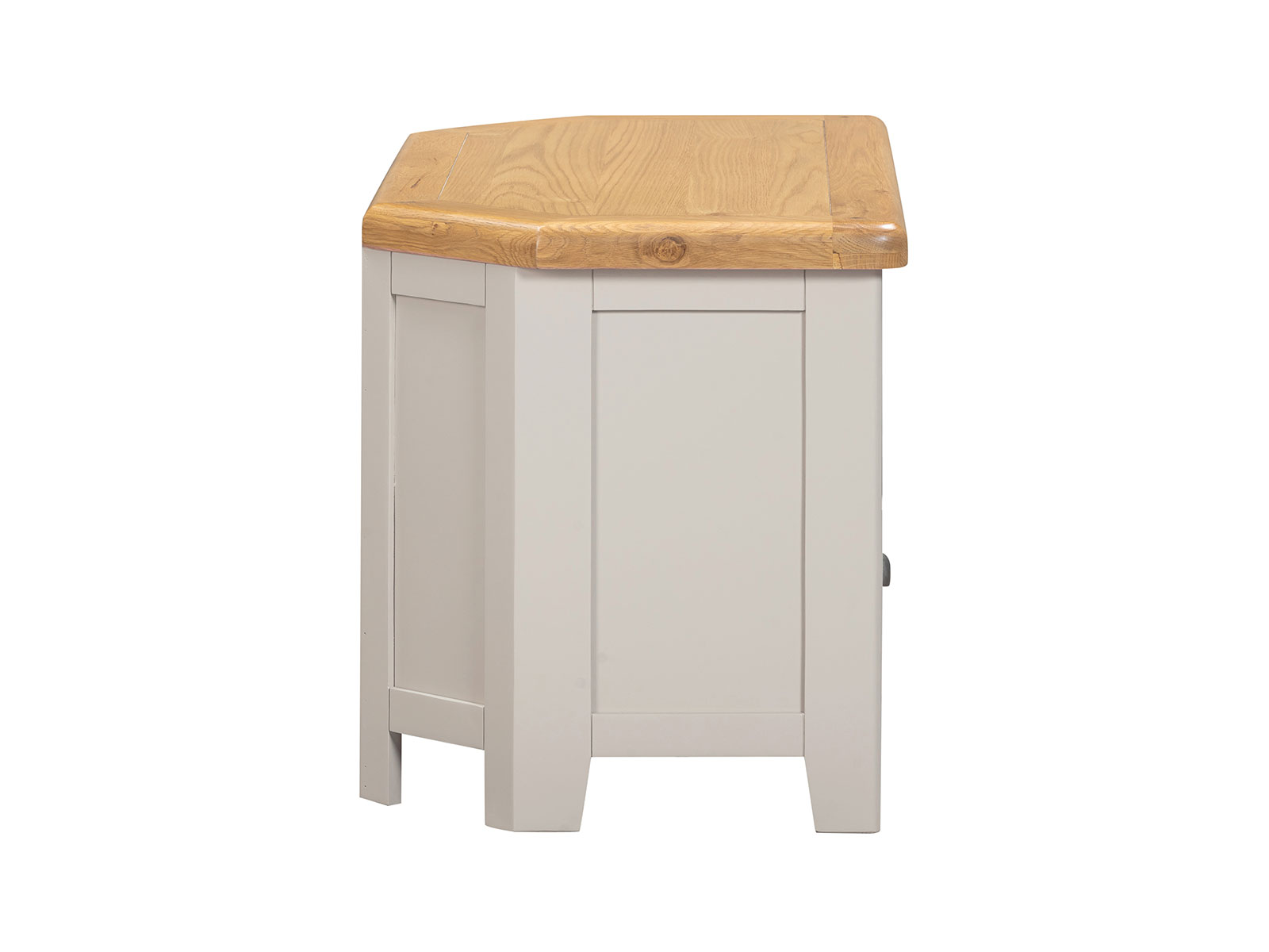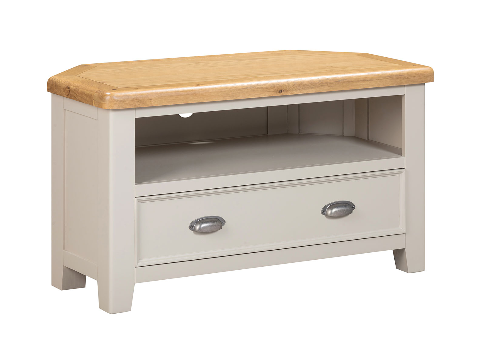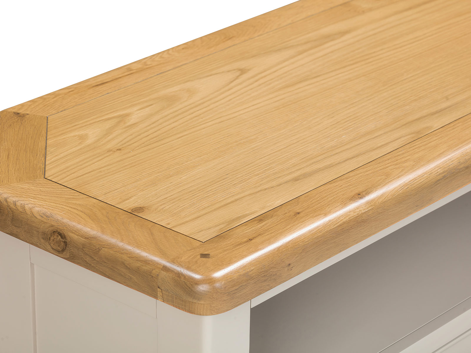 is manufactured with bases & legs in a light grey and finished with oak tops in a warm colour. Smooth, rounded corners, panelling and a retro cup handle give the range a traditional appeal for the modern home.
