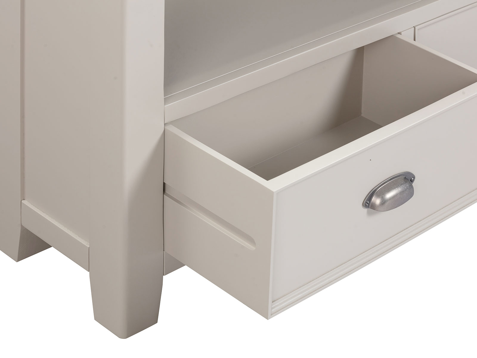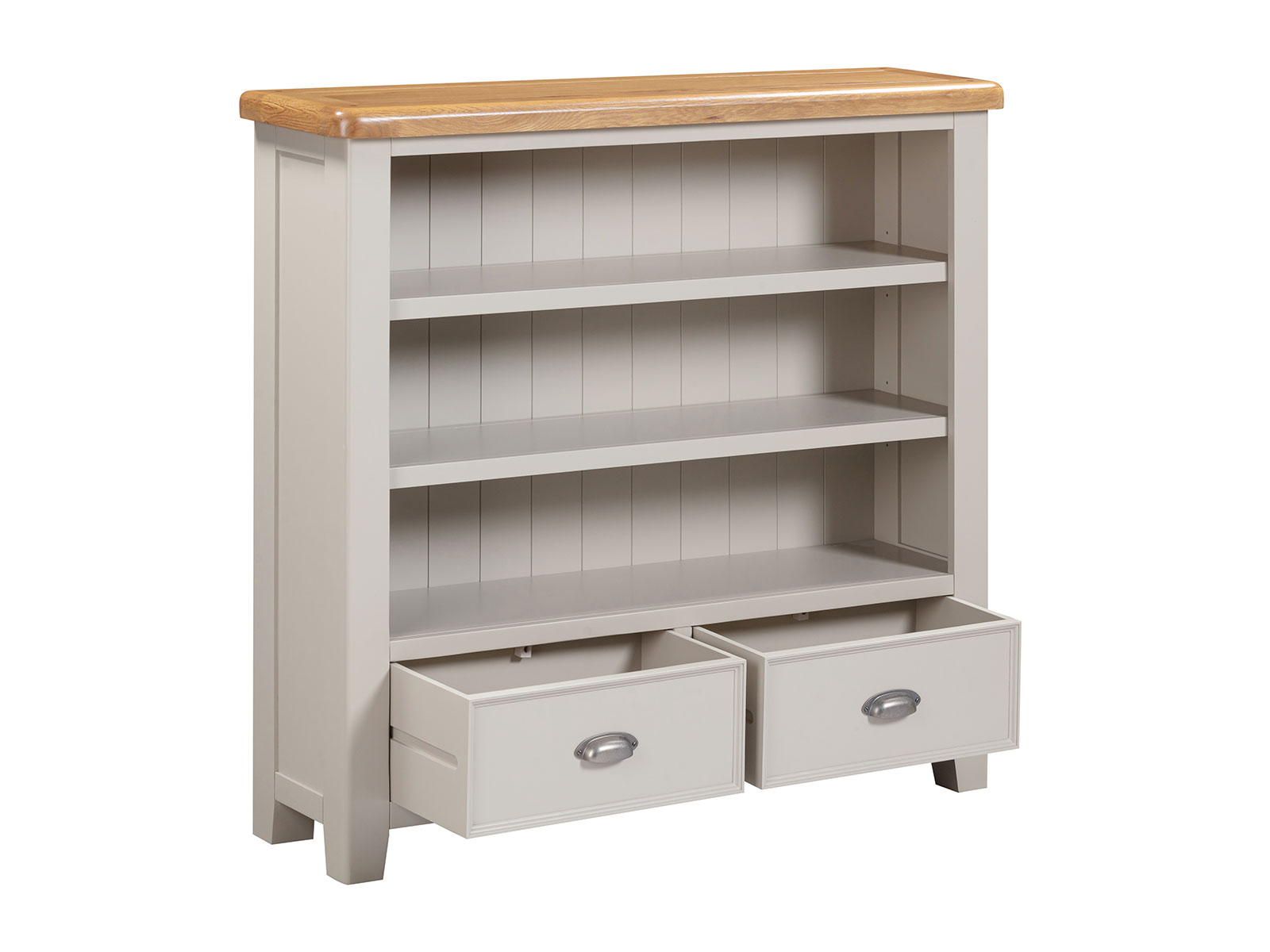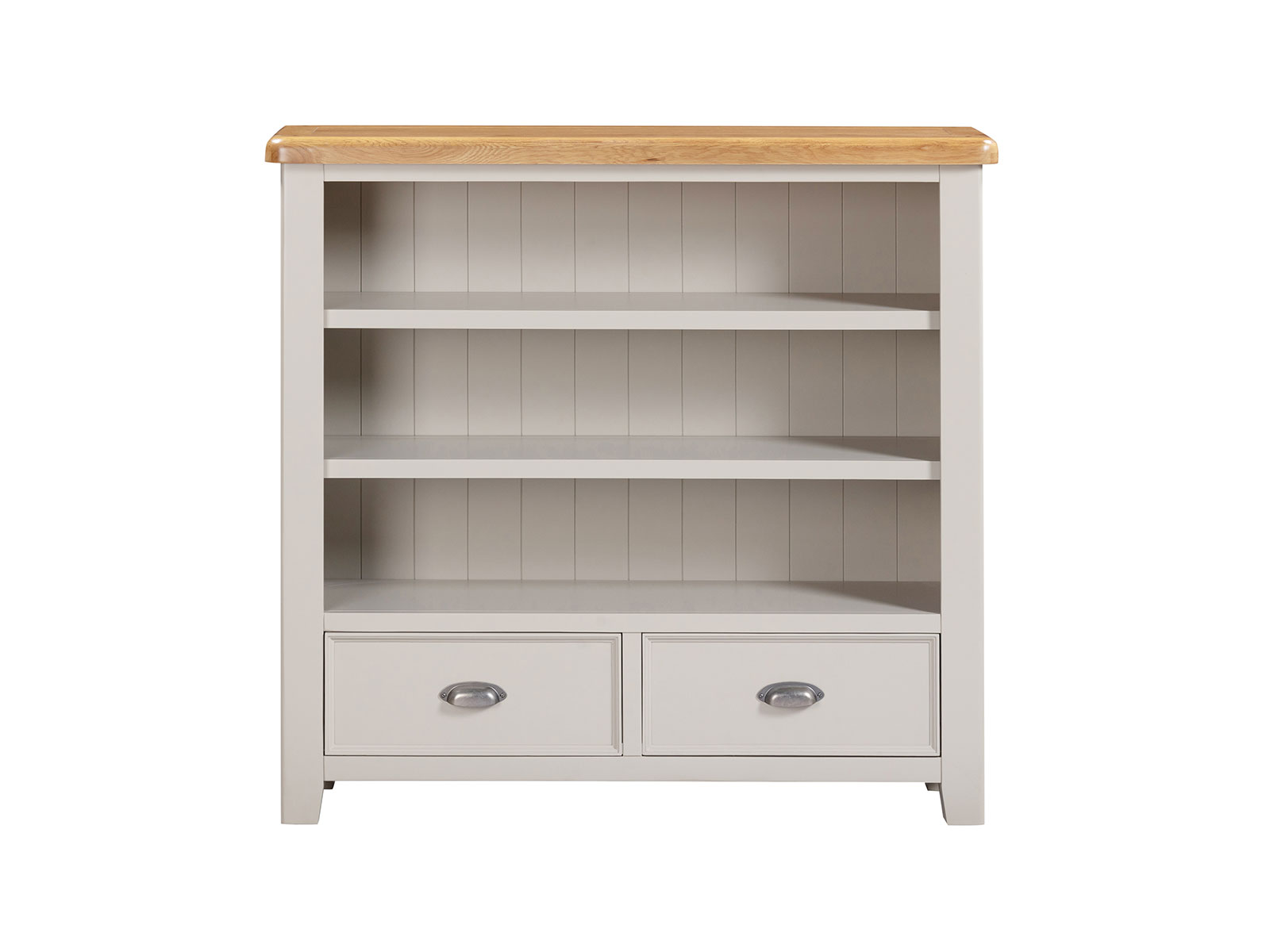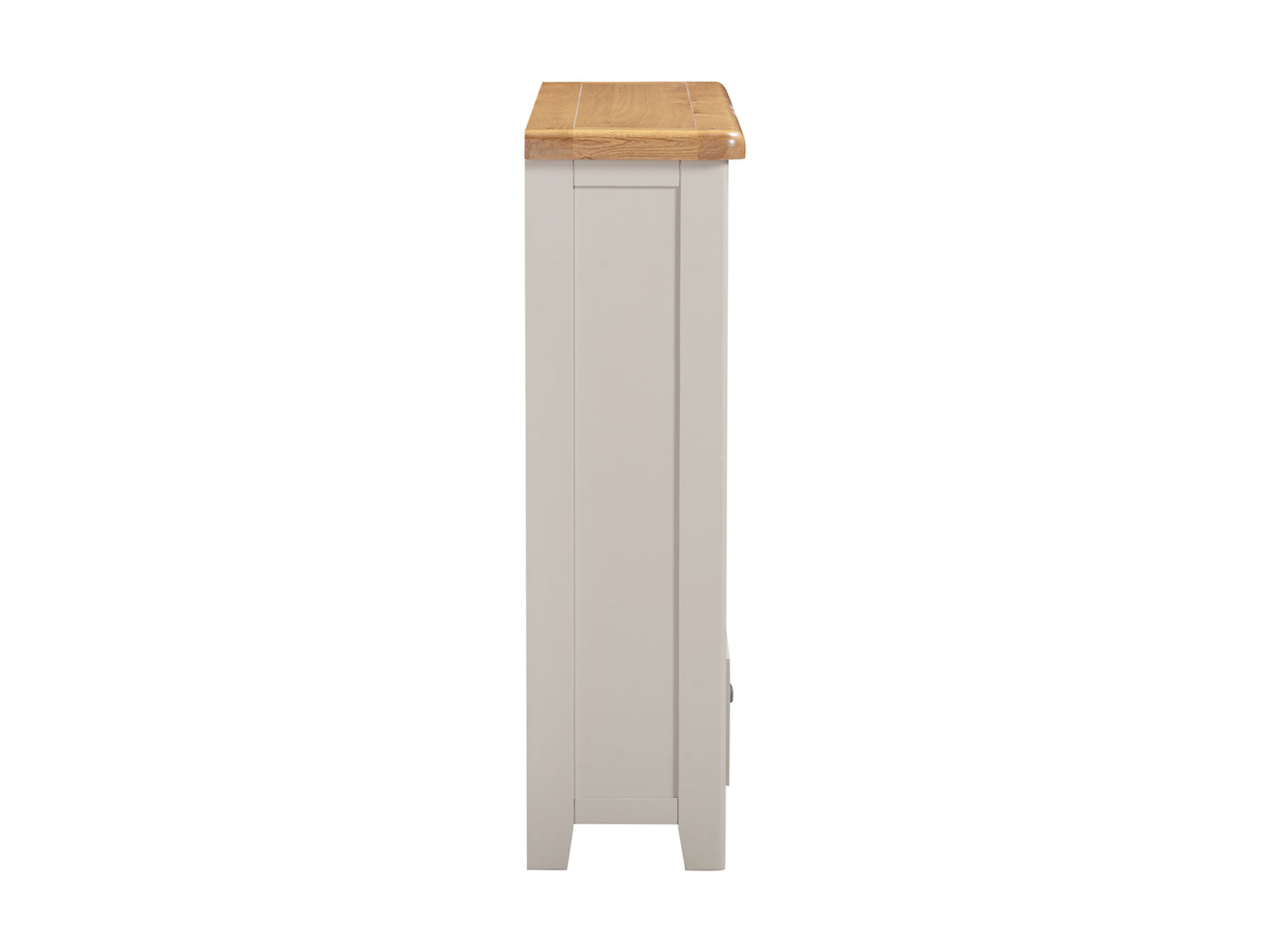 is manufactured with bases & legs in a light grey and finished with oak tops in a warm colour. Smooth, rounded corners, panelling and a retro cup handle give the range a traditional appeal for the modern home.