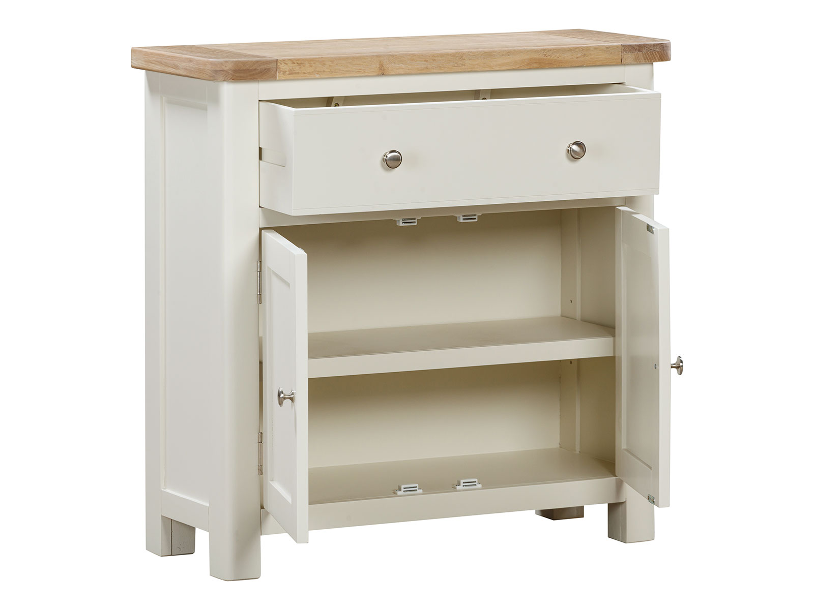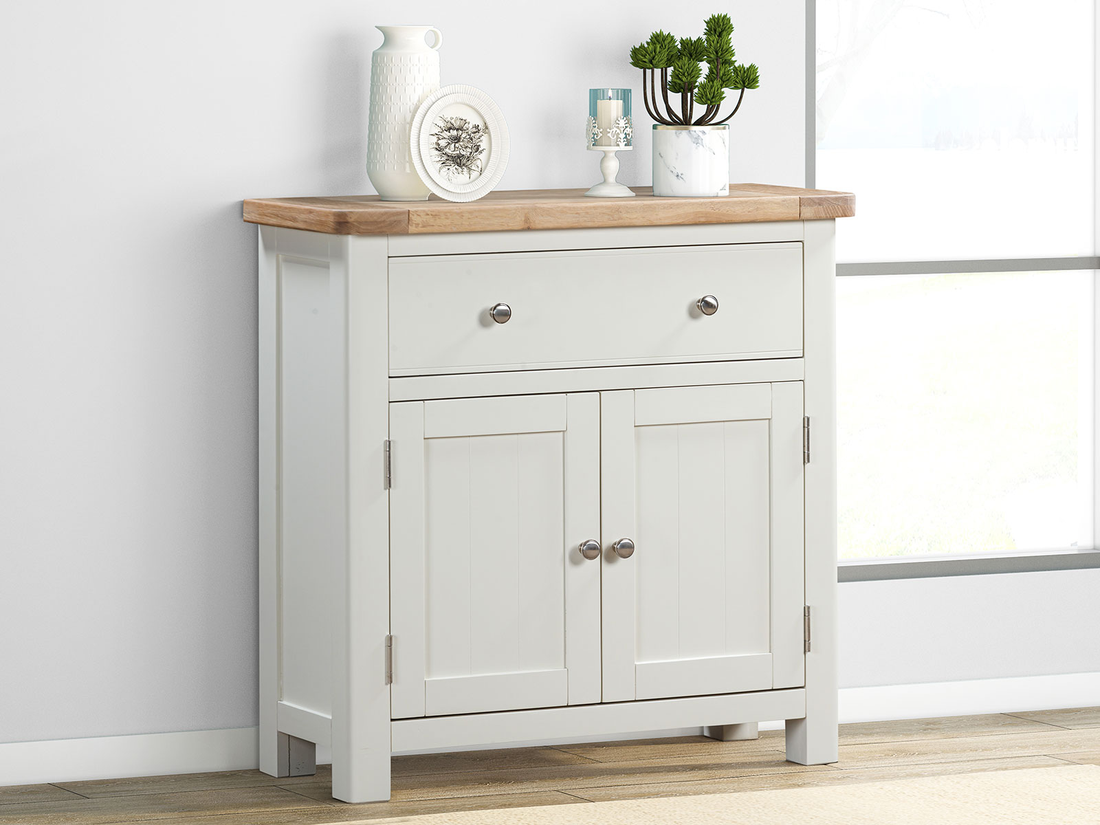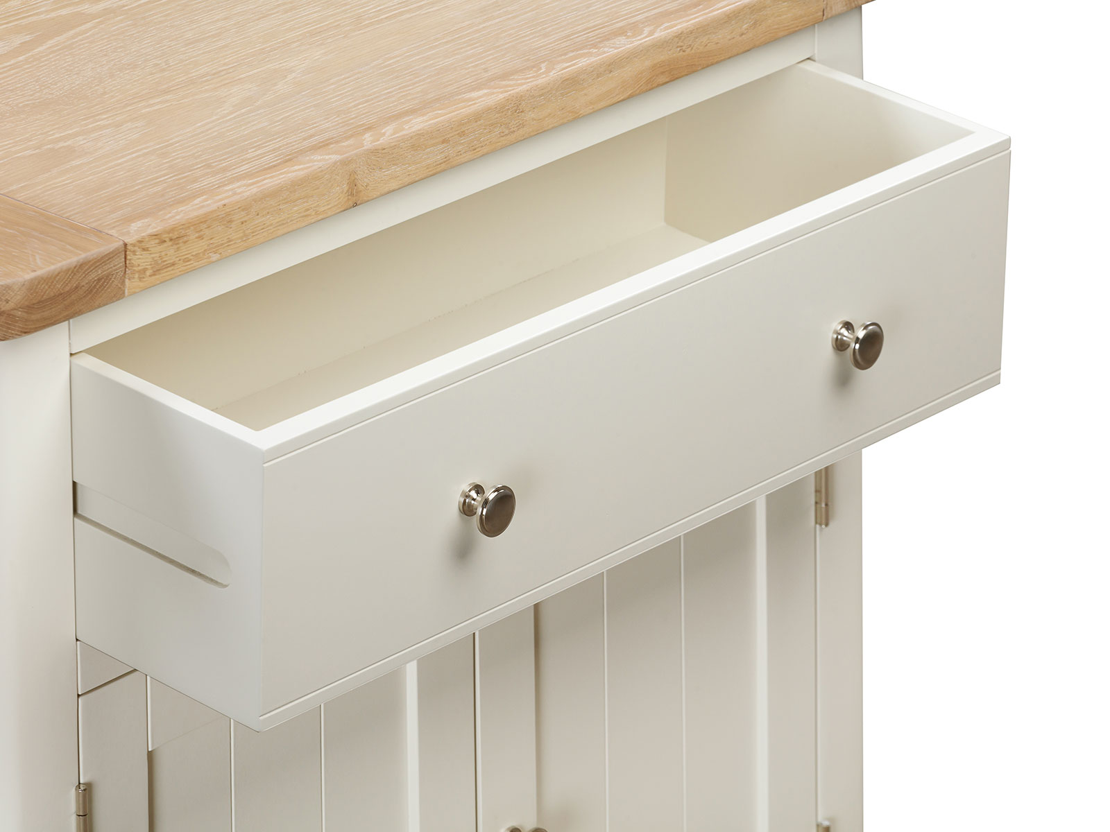 The Furniture Mill Hampton Painted range of furniture is characterised by its contemporary washed oak top, clean shaker style and off-white finish. Each piece comes with a choice of handle: round stainless steel knob or retro cup handle.