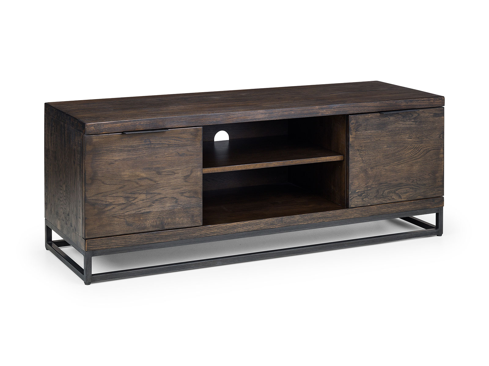 Made from solid oak, this TV Unit offers a rustic dark oak finish emphasising the stunning natural wood grain. The BrooklynTV Unit offers a vintage edge featuring industrial style metal legs. Feautring two cupboards with shelves, and an additional shelf in the middle suitable for a console, this TV Unit is perfect for a wide range of modern décor. Part of the Julian Bowen Brooklyn Dining and Occasional Collection.