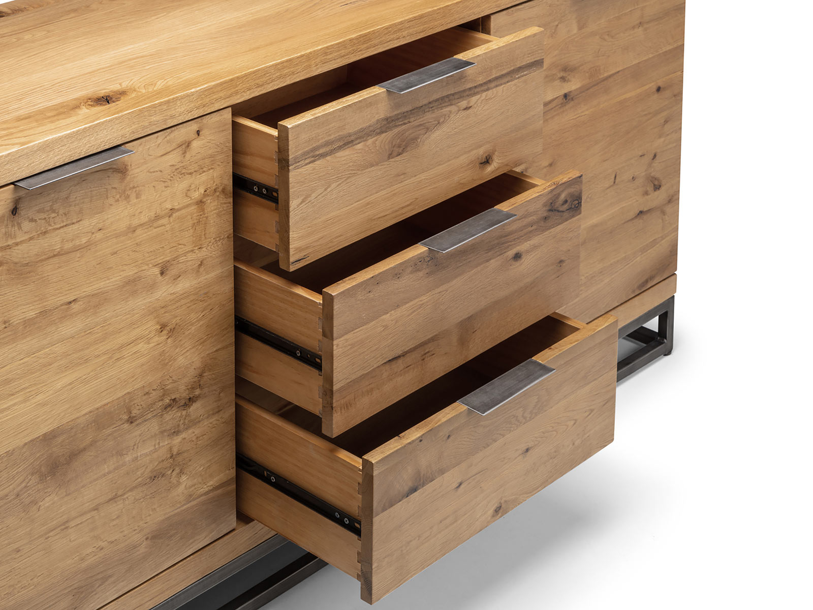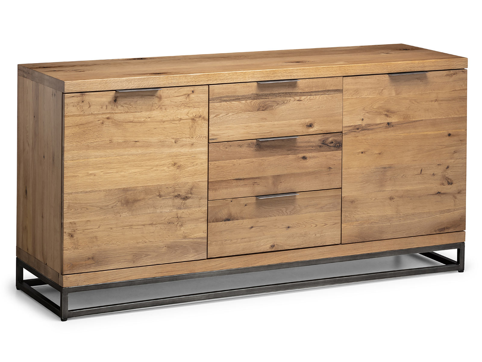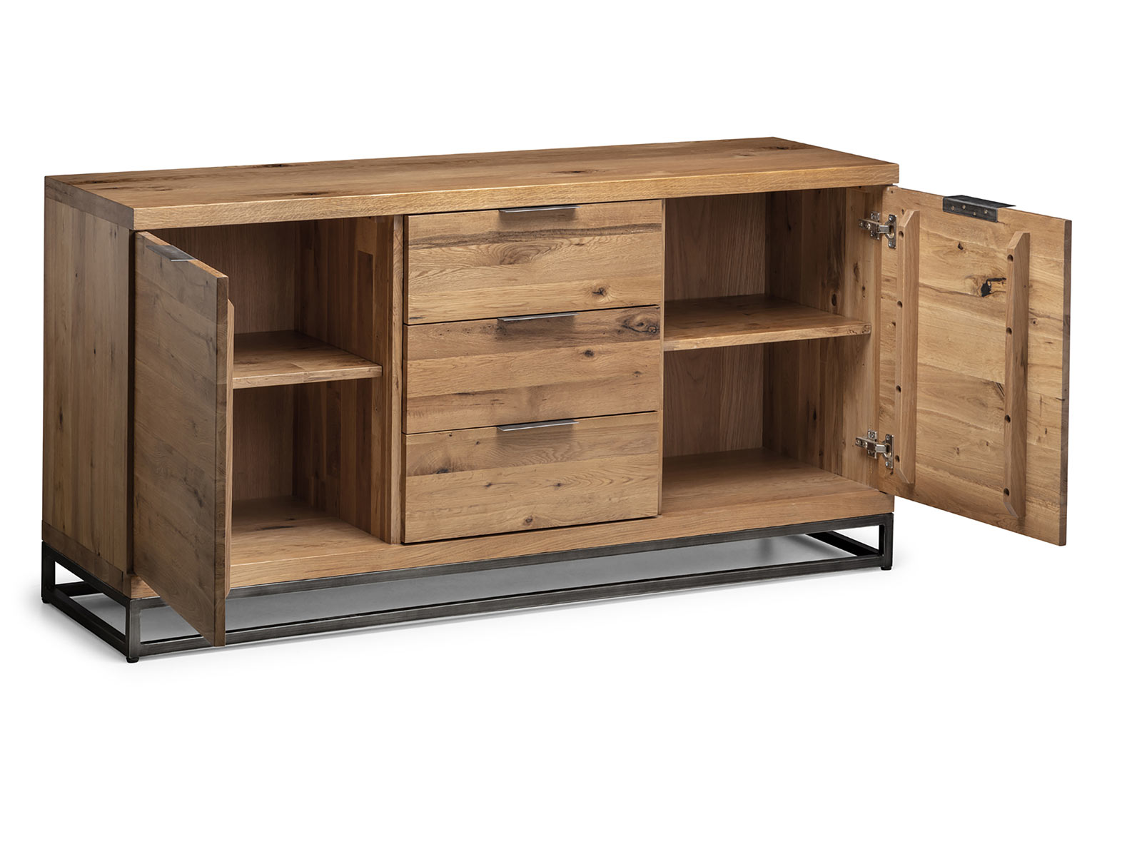 Made from solid oak, this Sideboard offers a rustic finish emphasising the stunning natural wood grain. The Brooklyn Sideboard offers a vintage edge featuring industrial style metal legs. Featuring two spacious cupboards with shelves, and three drawers, this sideboard is perfect for a wide range of modern décor. Part of the Julian Bowen Brooklyn Dining and Occasional Collection.