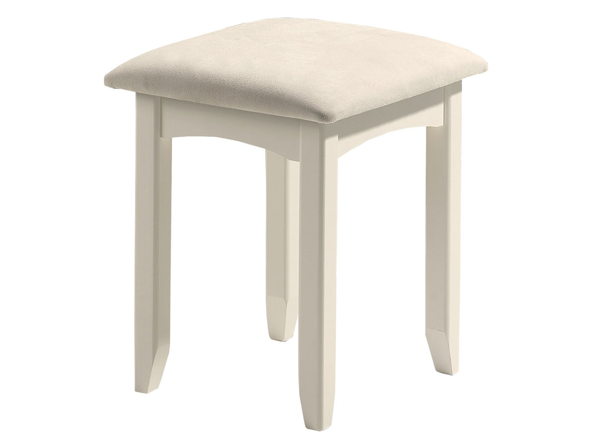 A stone white lacquered; shaker style stool with fauxsuede seat pad.