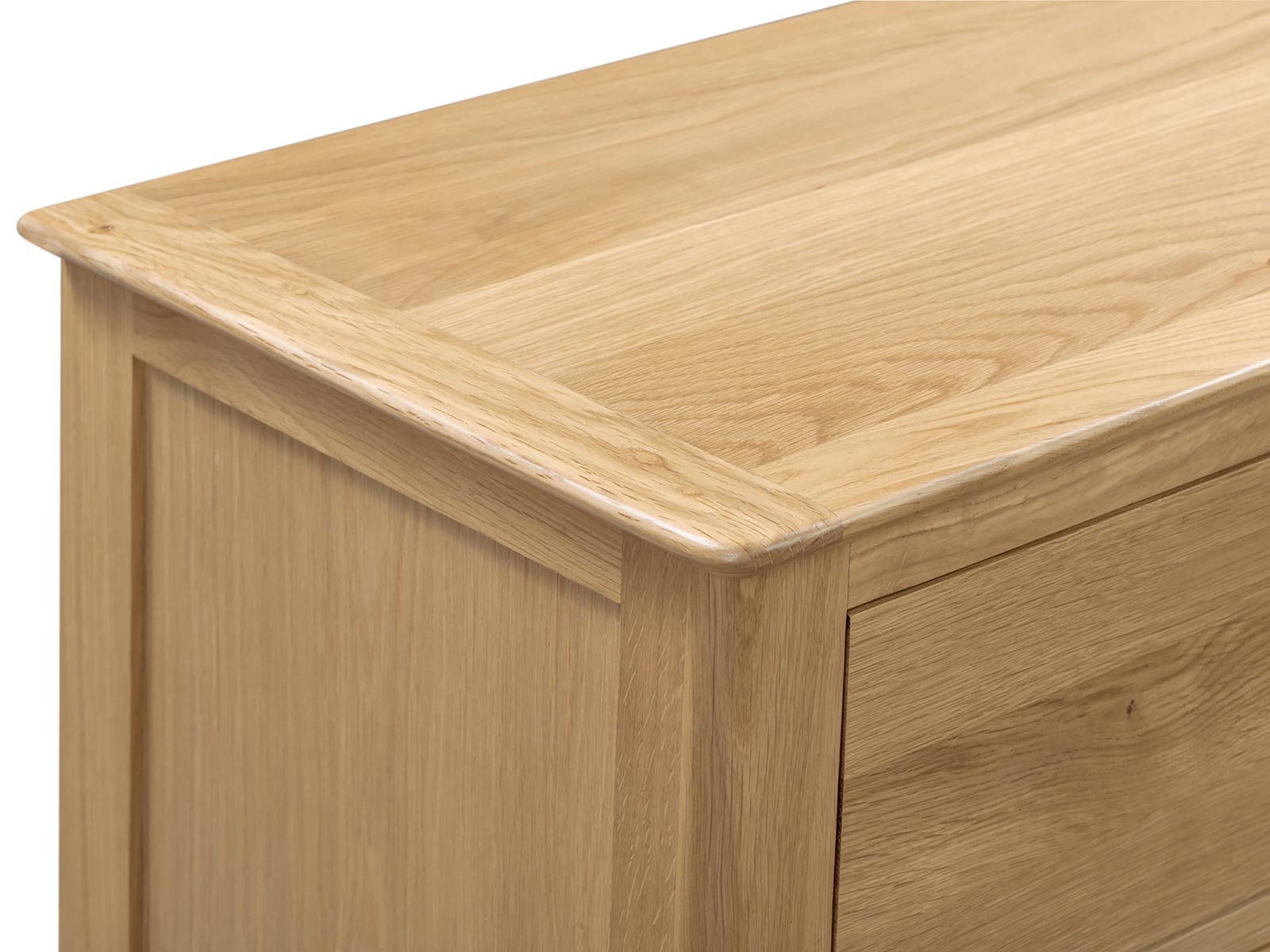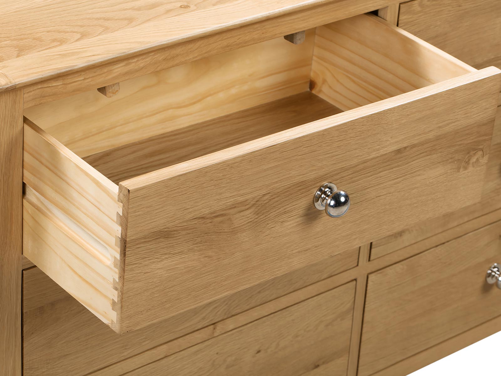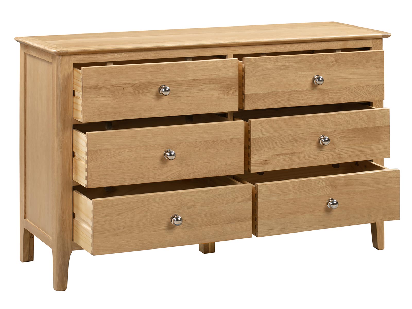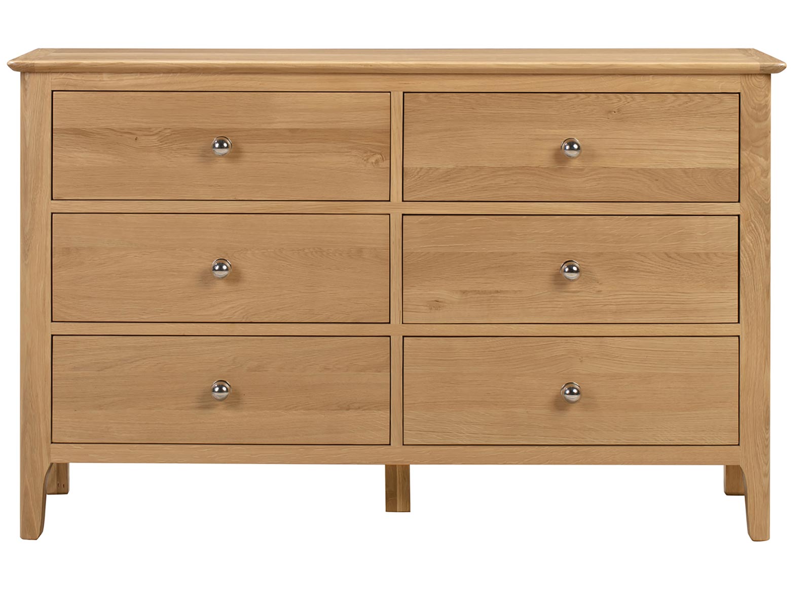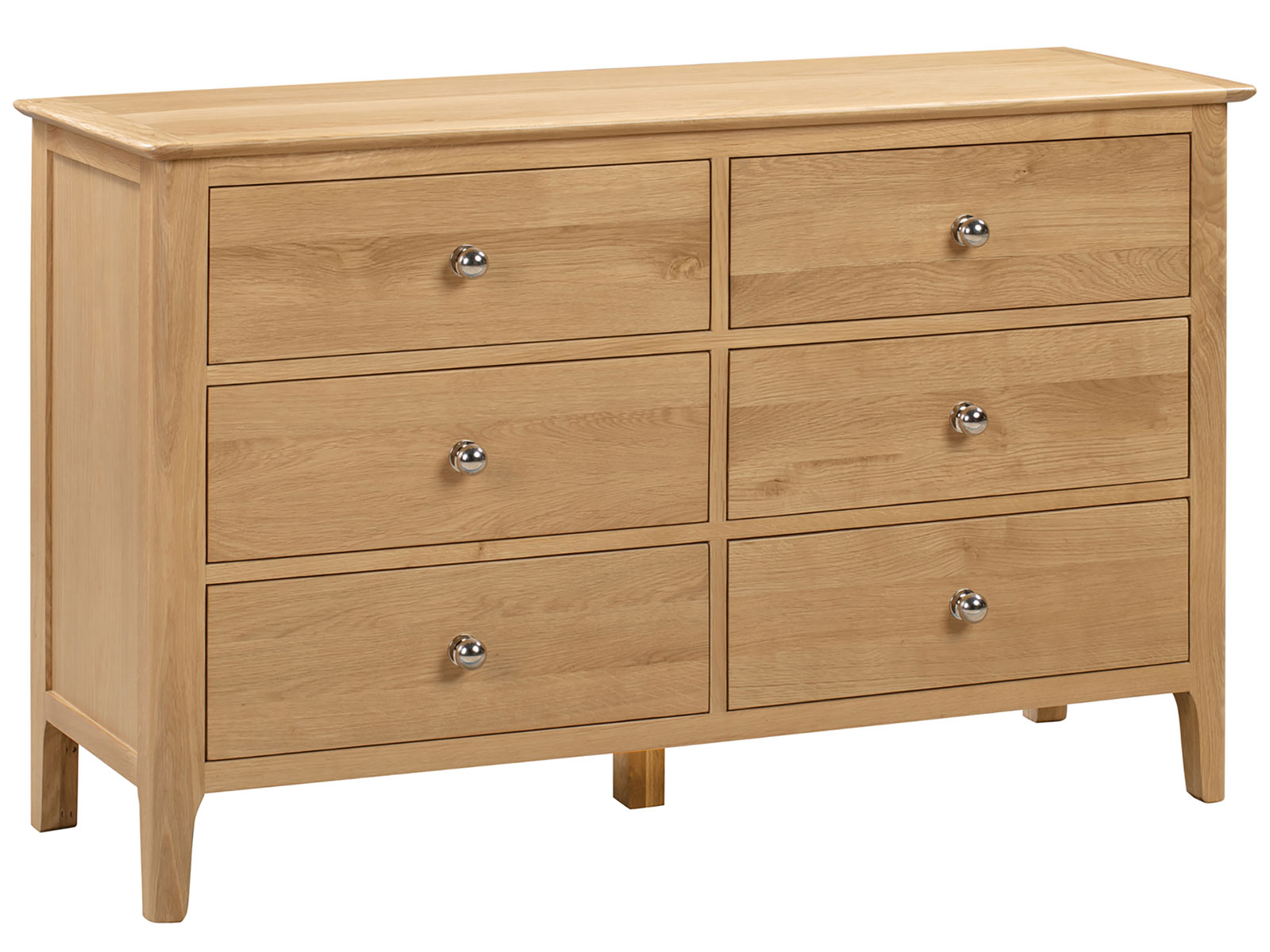 Crafted from solid oak and oak veneers, the Cotswold 6 Drawer Wide Chest ensures lasting durability with its robust structure. Featuring six large deep drawers, providing copious amounts of space to organise your belongings. This simple, yet elegant design is finished with a round silver knob, perfect for any traditional bedroom.