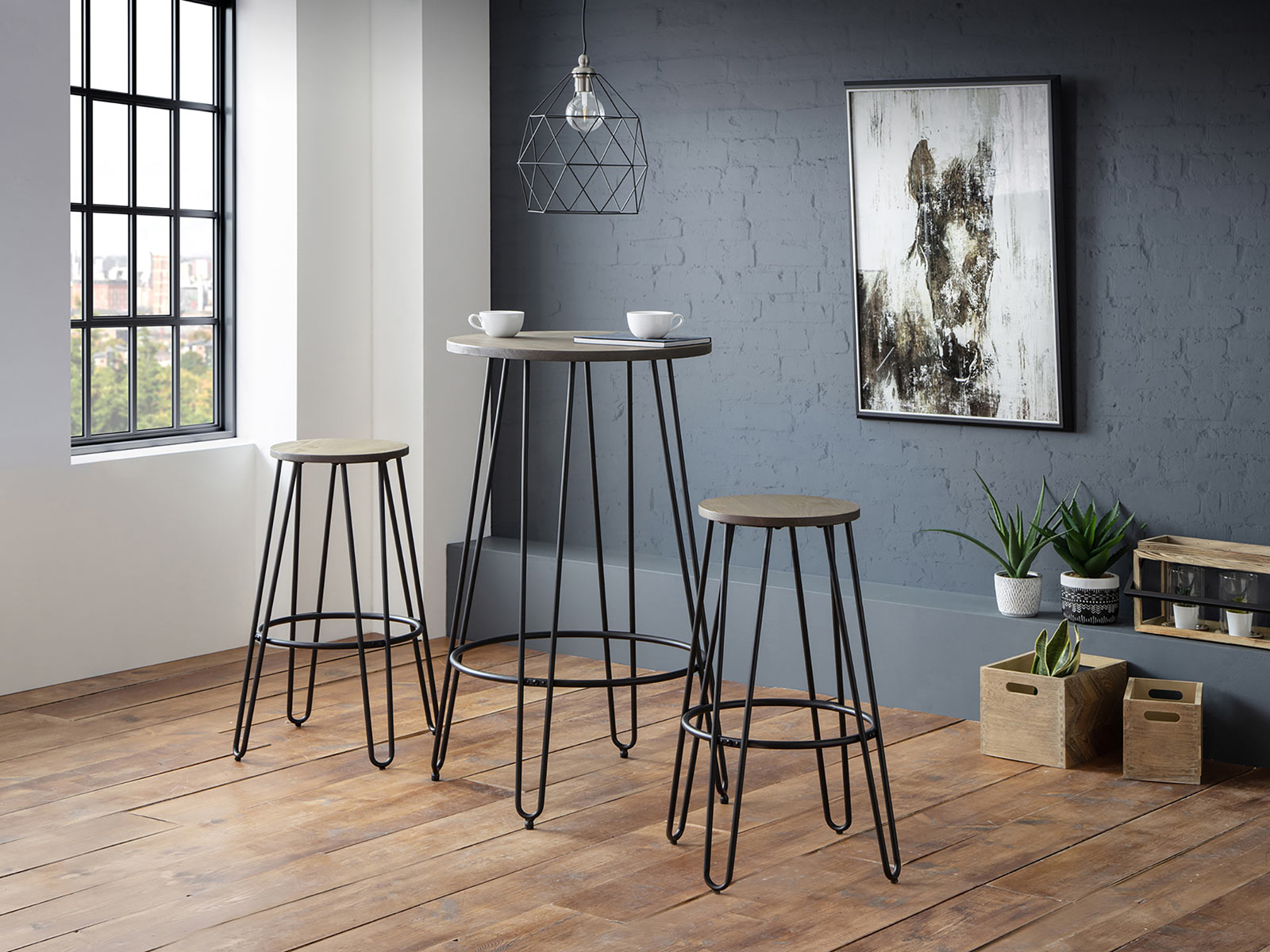 The Dalston Bar Stool features hair pin legs giving a modern, industrial look to any room. Crafted from solid Elm wood and Satin Black powder coated steel, this bar stool offers a durable, sturdy space-saving construction. Pair up with the matching Dalston Round Bar Table for an industrial bar set.