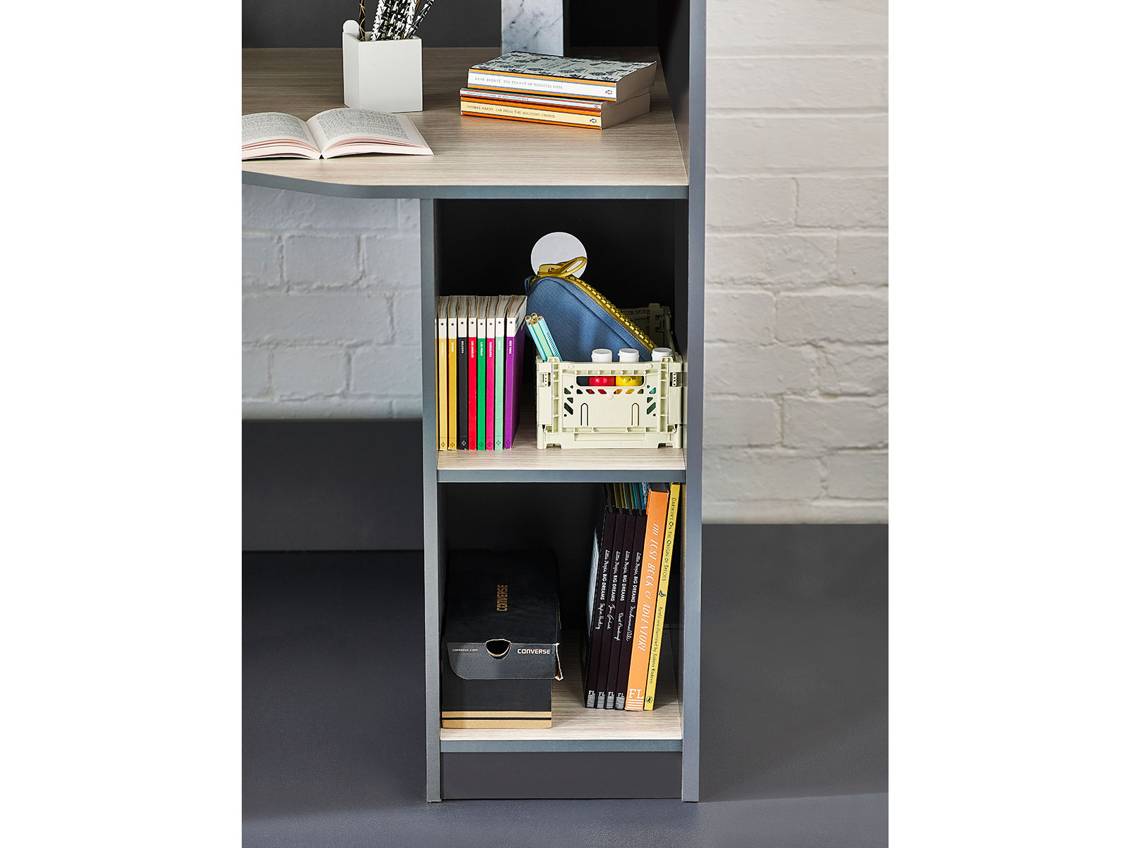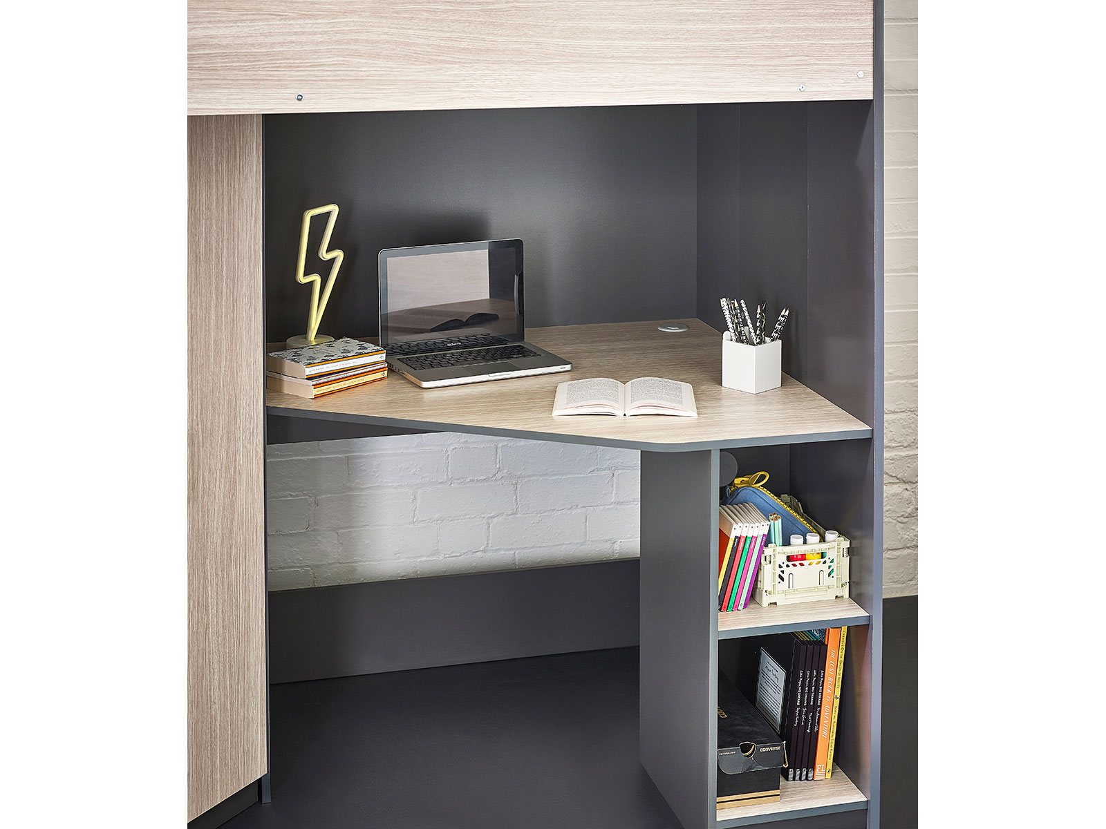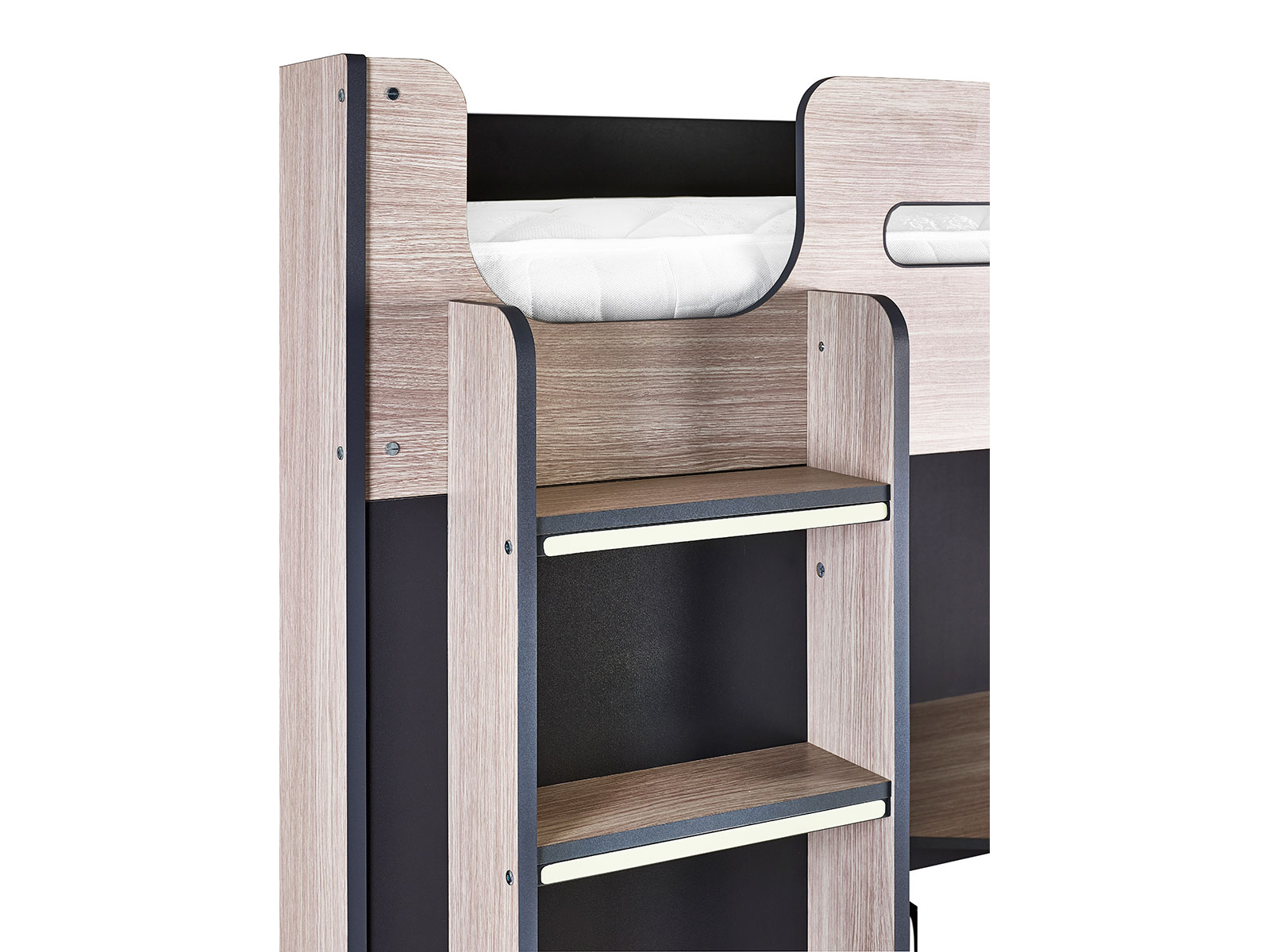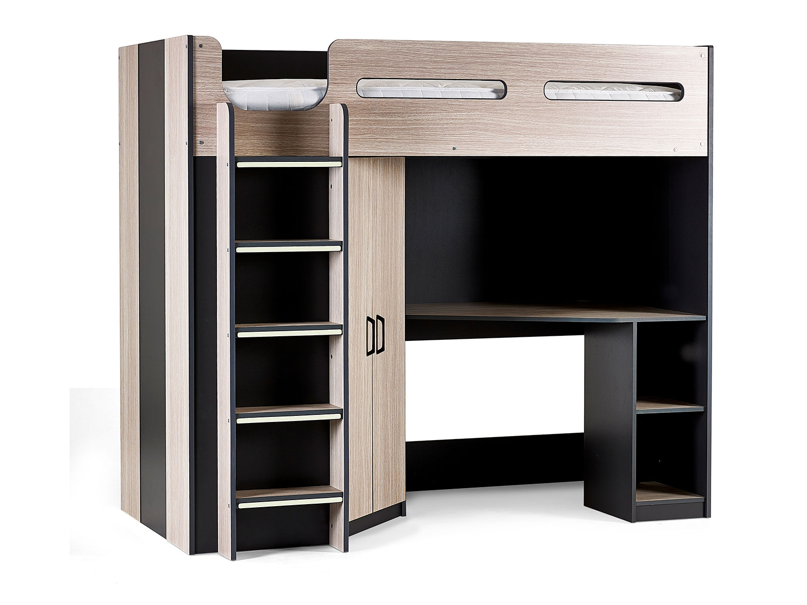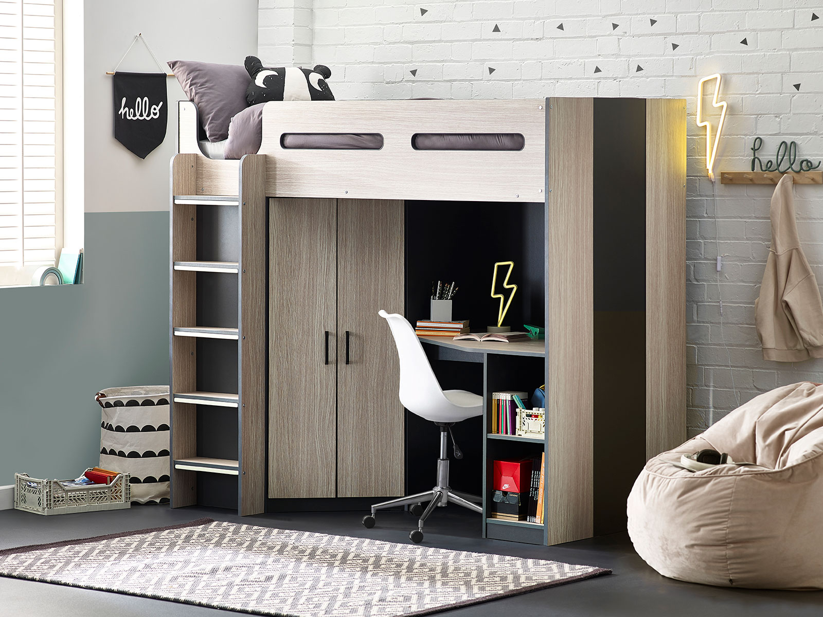 Designed with perfect functionality, the Hercules Highsleeper is the ultimate bed for your child. The angled wardrobe provides ample space for clothing, whilst the built-in shelving is great for all their files, folders, trainers, or games to stay organised. With glow-in-the-dark steps, and colourways of woodgrain and anthracite, white, and anthracite, there is an option for any interior style.