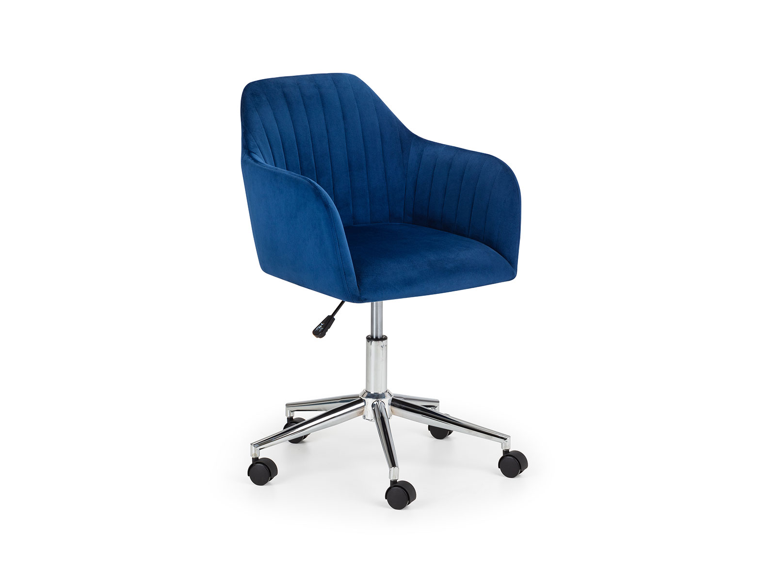 Finished in soft velvet, the Kahlo swivel office chair features a filled seat with a curved backrest, giving a beautiful look as well as maximum comfort. The height adjustable gas lift mechanism and wheeled swivel base provides practicality, whilst the pleated back adds to the traditional art deco design. Available in two beautiful colour options of blue or grey.
