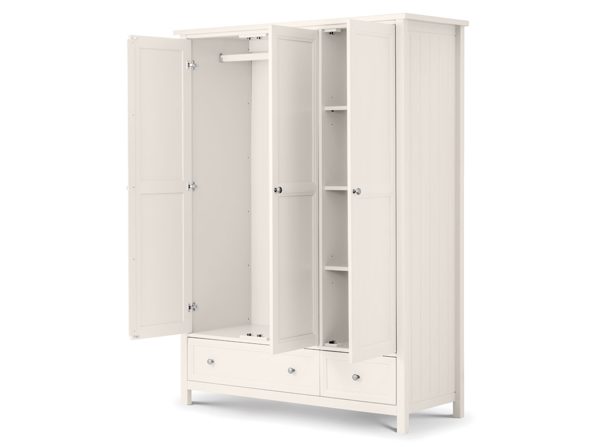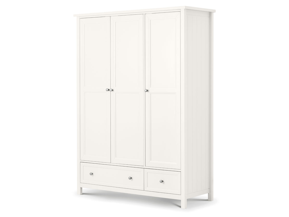 An elegant New England style wardrobe with three doors and two drawers. The combination of exquisite surf white lacquered finish with characteristic side panelling and detailed chamfered cabinetry makes for a soothing and refined aesthetic with timeless appeal, while delicate pewter handles add the perfect finishing touch.