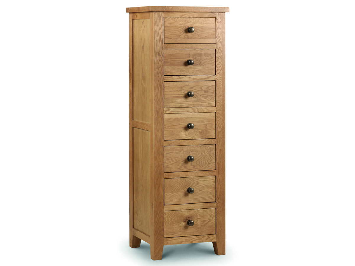 The Marlborough Oak 7 Drawer Narrow Chest is constructed from solid American White Oak and Oak Veneers; with a 30mm chunky top; clean lines and a sumptuous waxed finish. Drawers are constructed with Dovetail Joints.